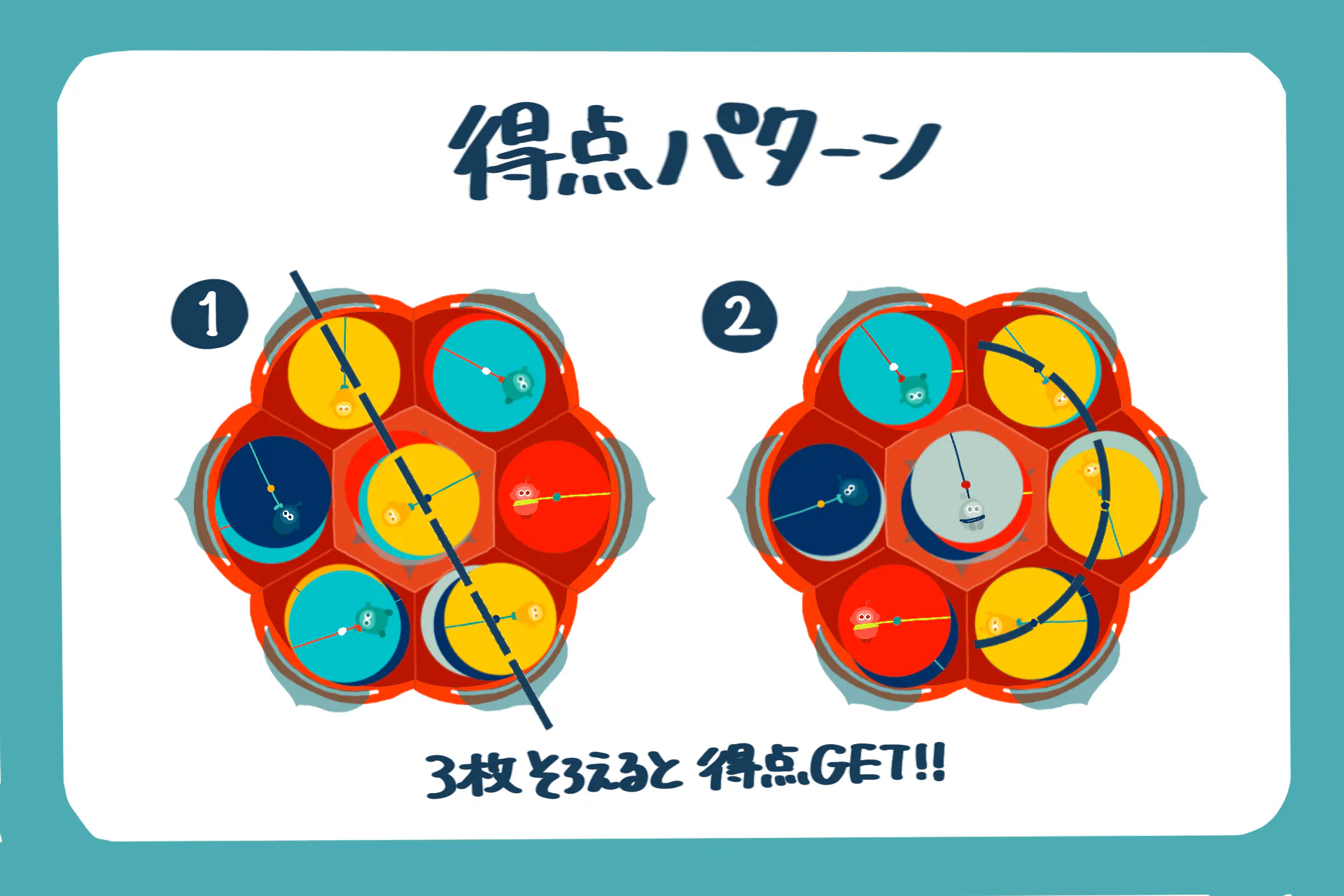 それぞれ重なった一番上のカードを見て、3枚揃えると得点できます。