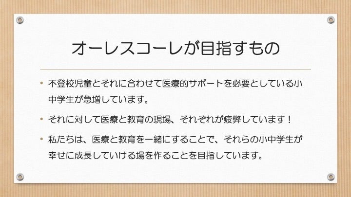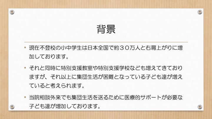 現在当院の相談外来を受診されている医療的ケアを必要としている子ども達のうち、在籍校に通うことが困難となっている子ども達が安心して楽しく通える医療連携型の学校を作りたい。
