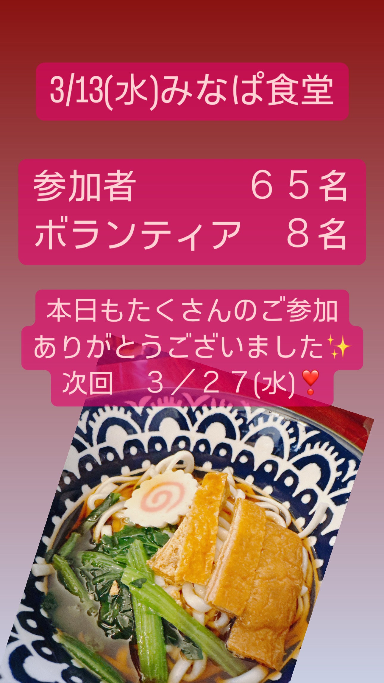 第11回みなぱ食堂参加者 58名ボランティア 10名春休み中でしたが、たくさんのご参加となりました!ありがとうございました!次回、来週水曜日4月3日 17:30