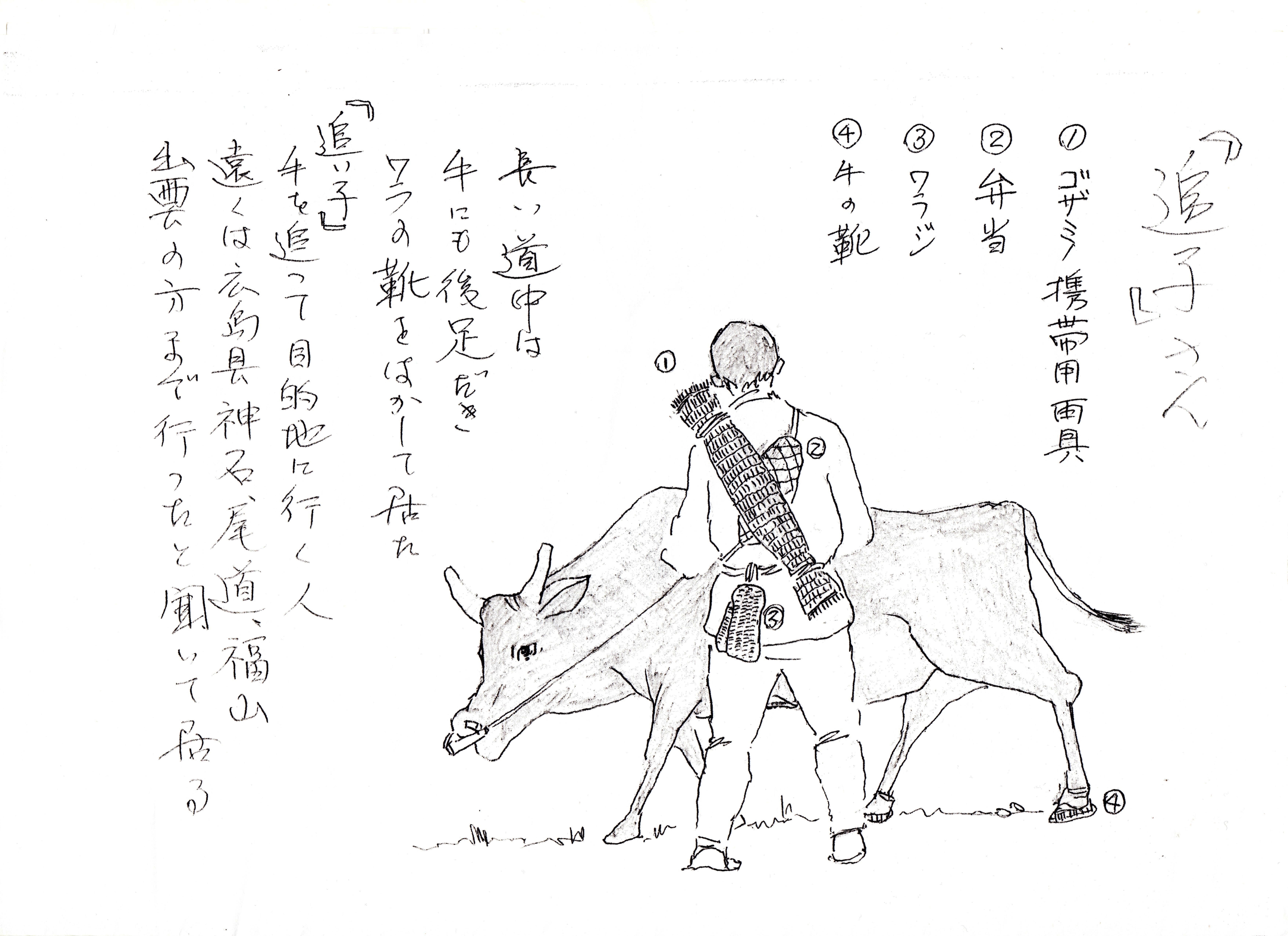 2024/03/04 21:23北広島町岩戸(岩戸村平田)に生まれた故隅井竹一先生(1923~2019年)は、学校長を退職後の昭和60年(1985年)に「絵で見る 昭和初年代の 農村のくらし」という画集を残されている。そこに『牛市』と題した1頁があり「秋に入って牛市が立つ。峠を一つ越えて島根県側の田所村の亀谷市や出羽村出羽市は大きな市だった。二、三日前後は毎日延々と牛の行列が続いた。・・・」とあり、博労たちが売買する牛たちは追い子に追わせて、それぞれのところを往復した。1人の追い子は3~4頭の牛を追っていて、牡牛は竹竿に繋がれ背中にえびす菰を飾った様子が分かる。この県境のしずく峠を越えた博労たちが宿泊した出羽市の「牛宿帳」には、広島県の安佐郡久地村、鈴張村、山県郡戸河内村、加計町、安野村、本地村、八重村、壬生村等々の博労の名前を見ることができる。 陰陽をつないだ石州街道(岩戸)を追われていた!しずく峠を越えると田所村奥亀谷になる隅井竹一先生の甥 横路さんから話しを聞く青原監督 もっと見る