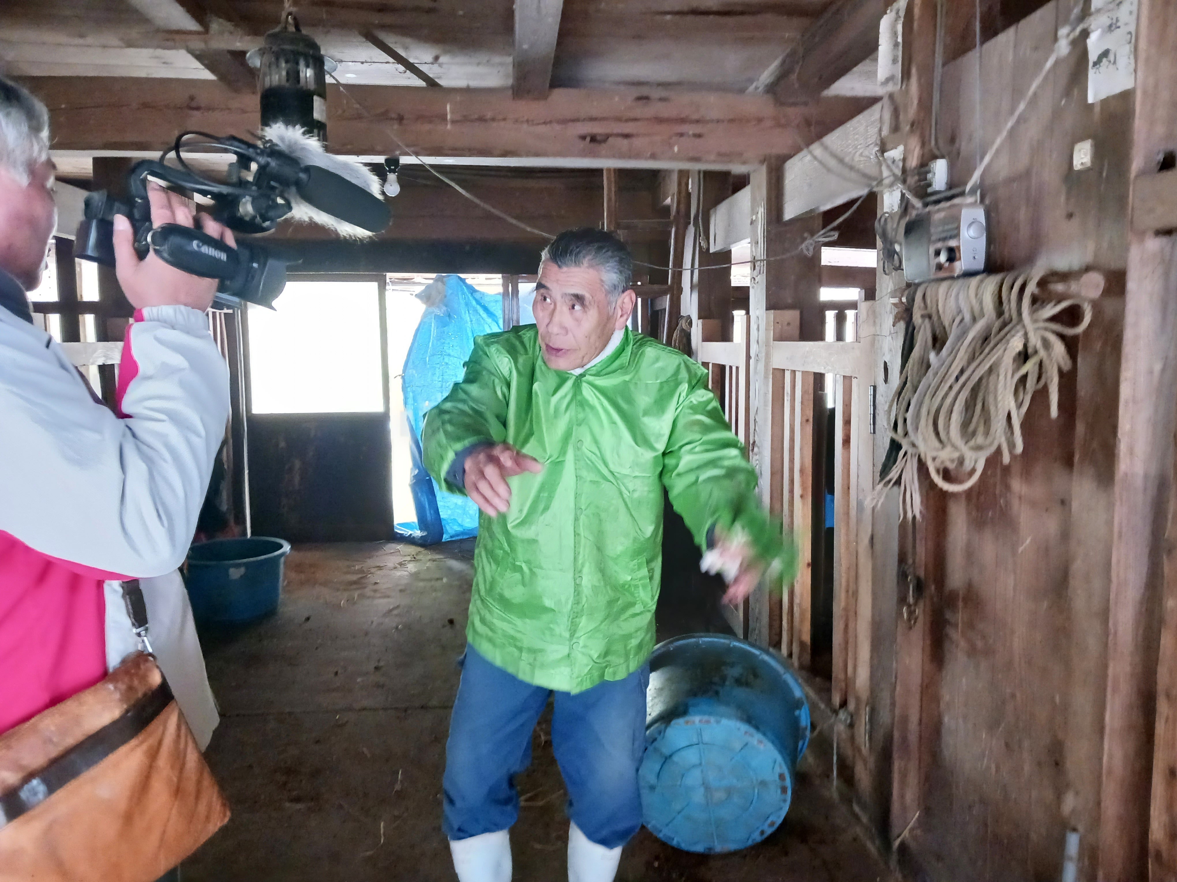 • 雪のひな祭り~3月3日日曜日、安芸高田市で家畜商と和牛の繁殖と育成を手がける杉原牧場を取材しました。杉原洋さんは、2月3日(土)に北広島町千代田地域づくりセンターで開催した『豊松歳事記』上映会&トークショーに参加していただいた1人で、意見交換では若い頃から博労であることや花田植の飾り牛を出場させていることを語ってもらったことから、連絡を続けて本日の訪問取材と成りました。映画制作の中では、牛耕の様子を撮影したいという青原監督の思いがあり、牛と人が一心同体で行う作業である牛耕の手順や花田植の調教のことを聞かせてもらいました。花田植で10数頭の飾り牛が田んぼに入るポイントは、すべての牛と人が行列をなして動くことが華麗に見えるとのことでした。日暮れになり2時間の取材を終え帰り際、零下の冷え込みのなかでも夕方の牛飼い作業に戻るご夫婦の姿がありました。牛の守護神大仙神社のお札と牛靴えびす菰の説明をする杉原さん もっと見る