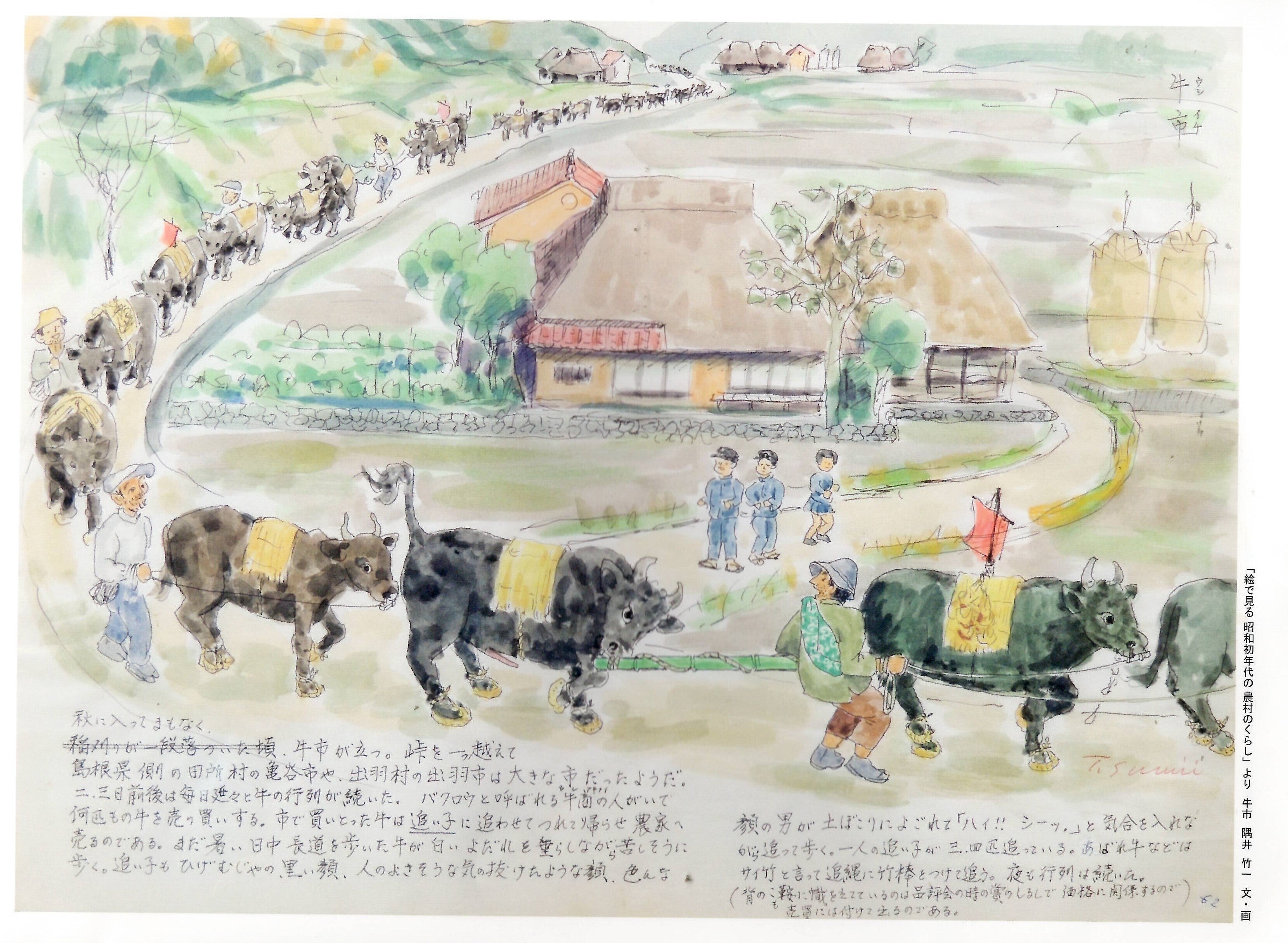 • 北広島町岩戸(岩戸村平田)に生まれた故隅井竹一先生(1923~2019年)は、学校長を退職後の昭和60年(1985年)に「絵で見る 昭和初年代の 農村のくらし」という画集を残されている。そこに『牛市』と題した1頁があり「秋に入って牛市が立つ。峠を一つ越えて島根県側の田所村の亀谷市や出羽村出羽市は大きな市だった。二、三日前後は毎日延々と牛の行列が続いた。・・・」とあり、博労たちが売買する牛たちは追い子に追わせて、それぞれのところを往復した。1人の追い子は3~4頭の牛を追っていて、牡牛は竹竿に繋がれ背中にえびす菰を飾った様子が分かる。この県境のしずく峠を越えた博労たちが宿泊した出羽市の「牛宿帳」には、広島県の安佐郡久地村、鈴張村、山県郡戸河内村、加計町、安野村、本地村、八重村、壬生村等々の博労の名前を見ることができる。                                             陰陽をつないだ石州街道(岩戸)を追われていた!しずく峠を越えると田所村奥亀谷になる隅井竹一先生の甥 横路さんから話しを聞く青原監督 もっと見る