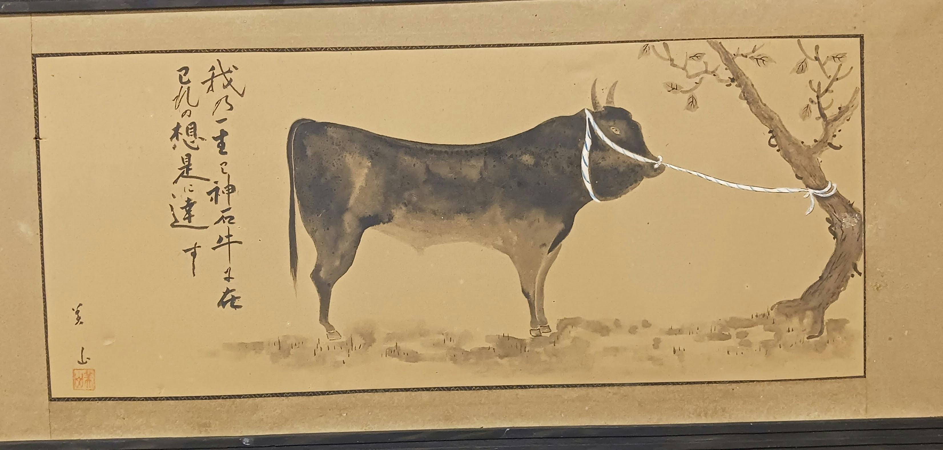 邑南町郷土館には、神石牛が描かれた一枚の額があります。町内高原地区で和牛を飼育していた農家に残されていたもので、主が亡くなり三十年以上経ってご子息が郷土館に持ってこられたものです。父親が出羽牛市で博労さんの仲介でもとめた神石牛を大切に飼っていたようで、その神石牛が死んだため絵に描き残してもらい仏間に掲げてあったといいます。