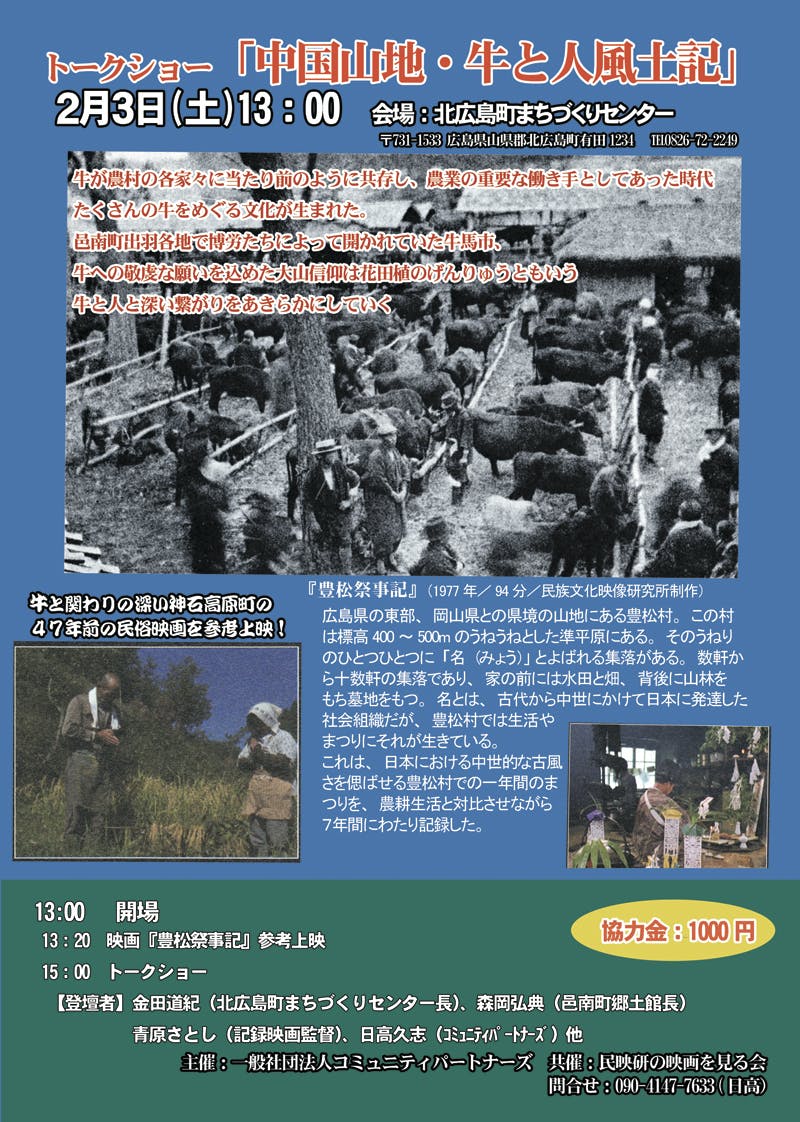 映画『中国山地・牛と人風土記』のテーマとしたトークショーを開催します!来る 2月3日午後1時より北広島町まちづくりセンターで開催します!