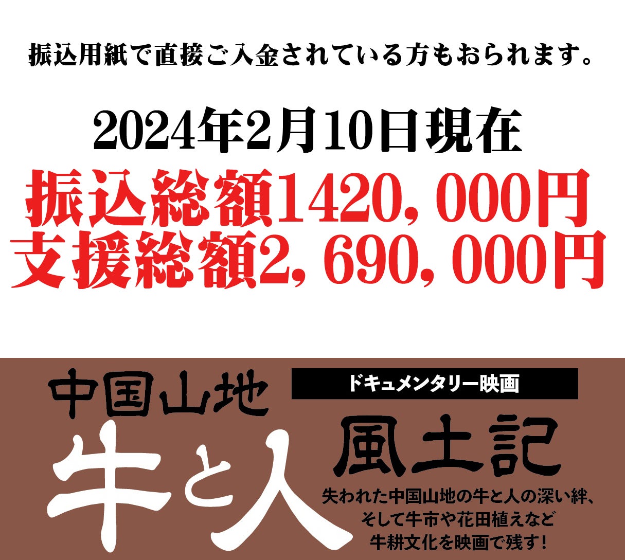 郵便振込で直接ご支援下さった方々の総額が、2/10現在で142万円に達し、本サイトから御支援下さった方を合わせると総額269万円です。本当にありがとうございます!本サイトからの振り込みはいよいよ明日の23:59で閉め切ります。ゆうちょ銀行に直接お振り込みでしたら2月29日まで受け付けております。よろしくお願いします。