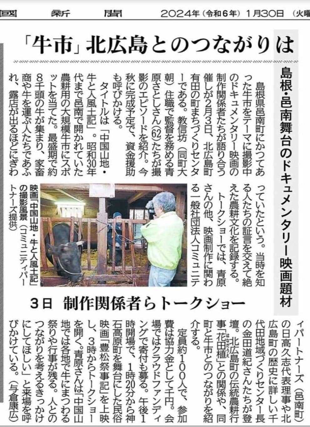 2月3日 北広島町千代田地域づくりセンターで開催した映画会とトークショーには、神石高原町や庄原市、広島市内に山県郡内、島根県から50名の方の参加をいただき開催しました。 映画は1977年の制作で、岡山県との県境の豊松村の祭時を丁寧に記録した作品で好評でした。トークショーは、千代田地域づくり センター長の金田道紀さんが、昭和初期の 山県郡の牛と馬について記録写真を元に話され ました。出羽牛馬市の記録を邑南町郷土館長 森岡弘典氏に話してもらいました。安芸高田市から来られた畜産農家の男性から、いろいろな参考になる発言をいただきました。
