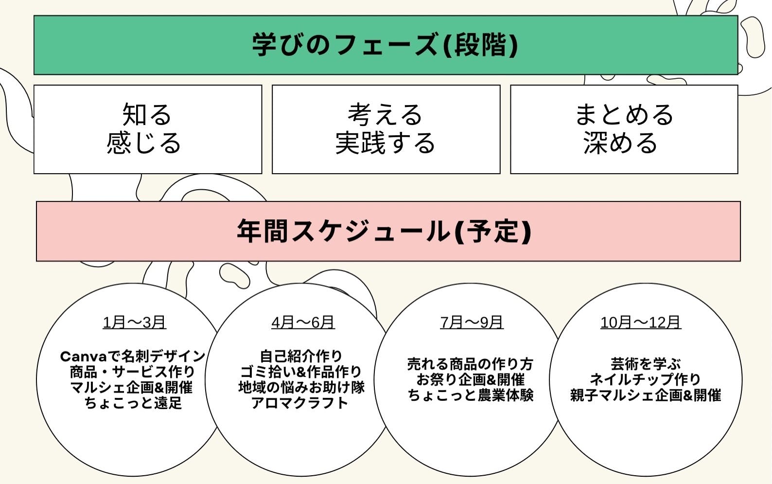 製作から販売までをサポートしながらお金や時間、思考力を学んでいく実践型のコミュニティです。