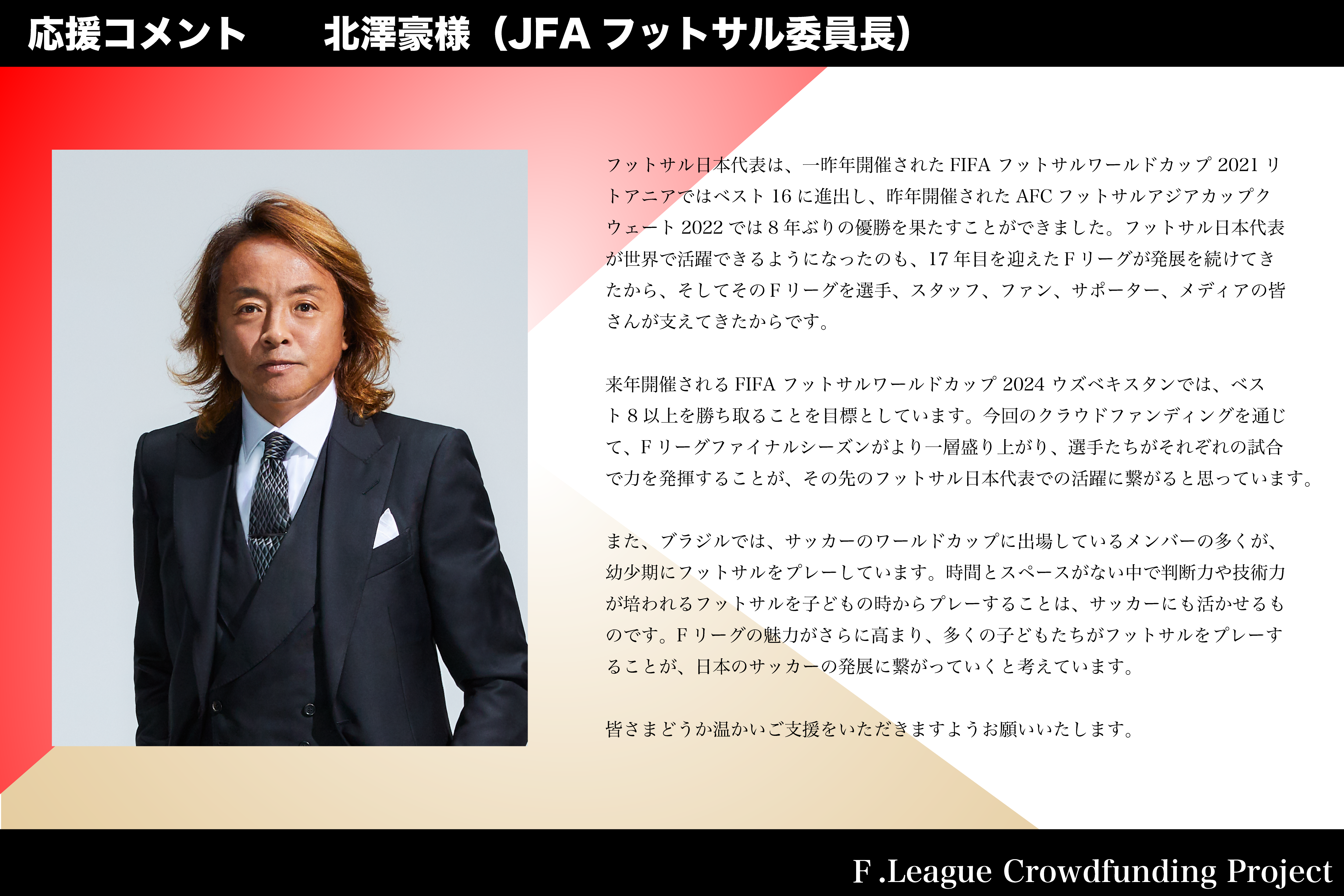 私たちは、多くの方々にフットサルの魅力をお伝えし、フットサルが身近にある日常を作り出せるリーグでありたいと考えております。Fリーグ全体が今よりも盛り上がりを見せ発展することで、サッカー・フットサル界全体が発展を遂げることができるよう、皆様のご支援を賜りたく、何卒、よろしくお願いいたします。
