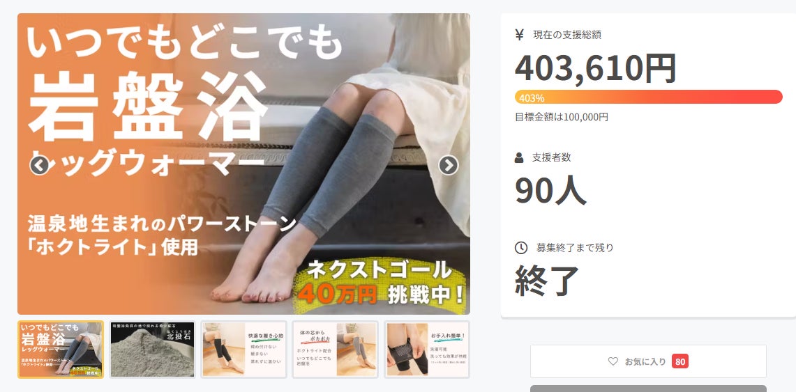 北投石を配合したレッグウォーマーは、400%を超える支援を達成!