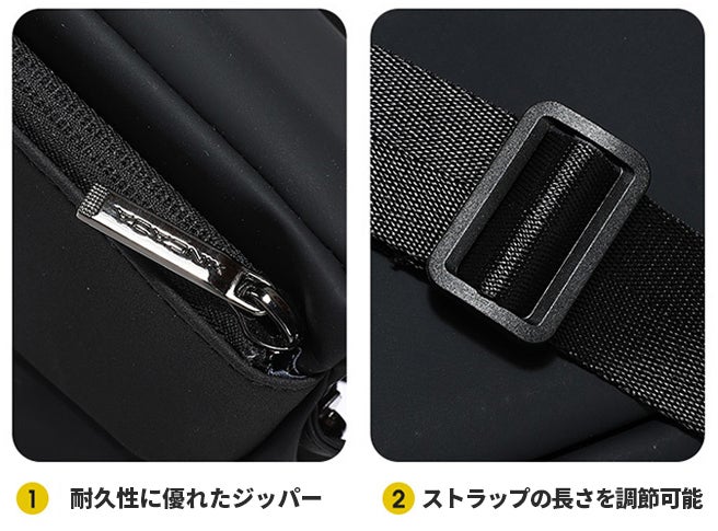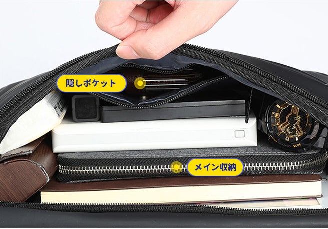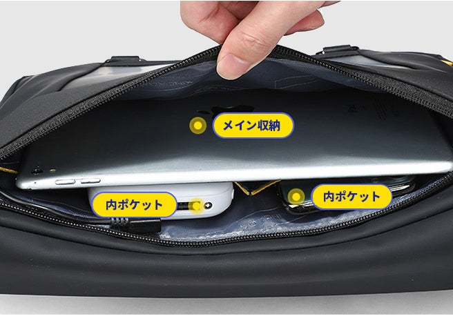 スマートフォンや財布など貴重品を安全に保管できるセキュリティポケット。