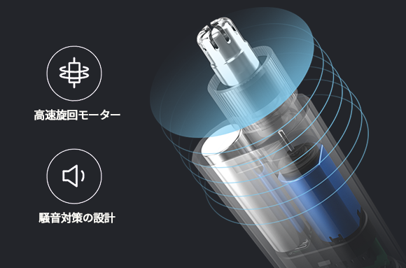 高速モーターはトルクが高いことに加えて寿命が長く、振動と騒音を抑える設計になっています。毛量が多い鼻毛を処理する時も、高い出力を維持してスピーディーにカットできるだけでなく、動作音も大変静かです。