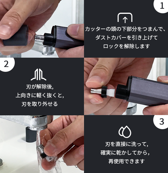 A3:独自の水洗い特許技術を取得しておりますので、刃は取り外さずに水に浸して洗うこともできますし、取り外してから洗うこともできます。内部に残った鼻毛は、スイッチをオンにすると排出穴から洗い流せます。刃はステンレスですので、水に濡れても錆びません。