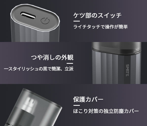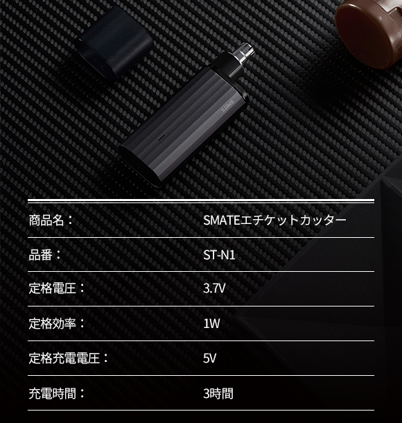 SMATEエチケットカッターはリチウムバッテリーを内蔵、USB Type-Cポートで充電できます。フル充電で約1年*使用可能です。