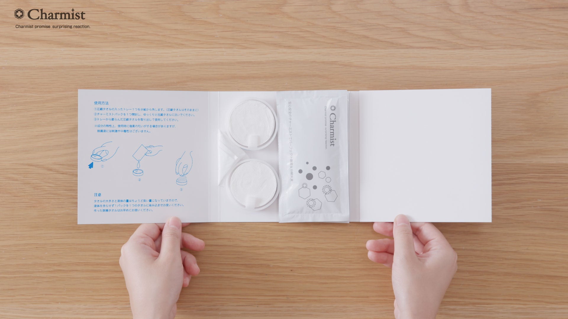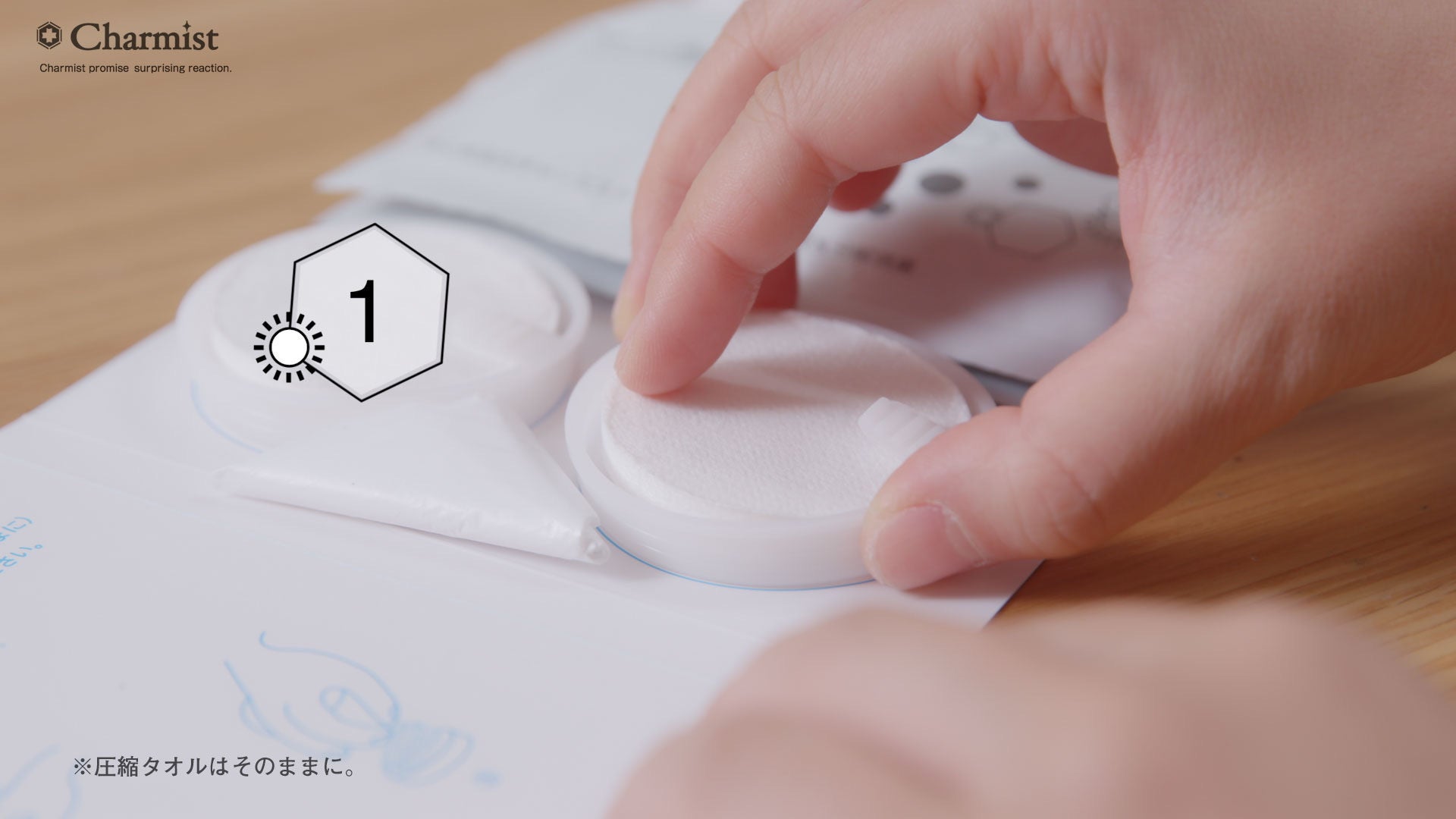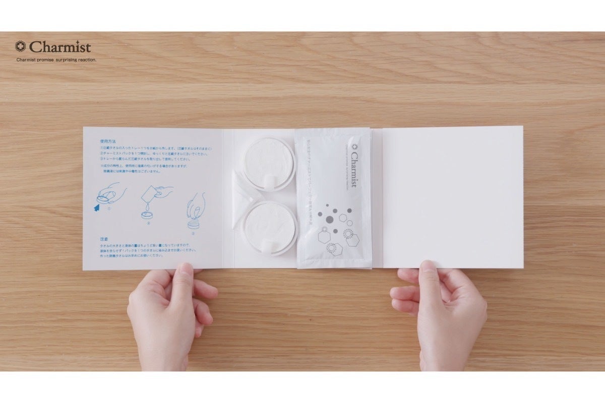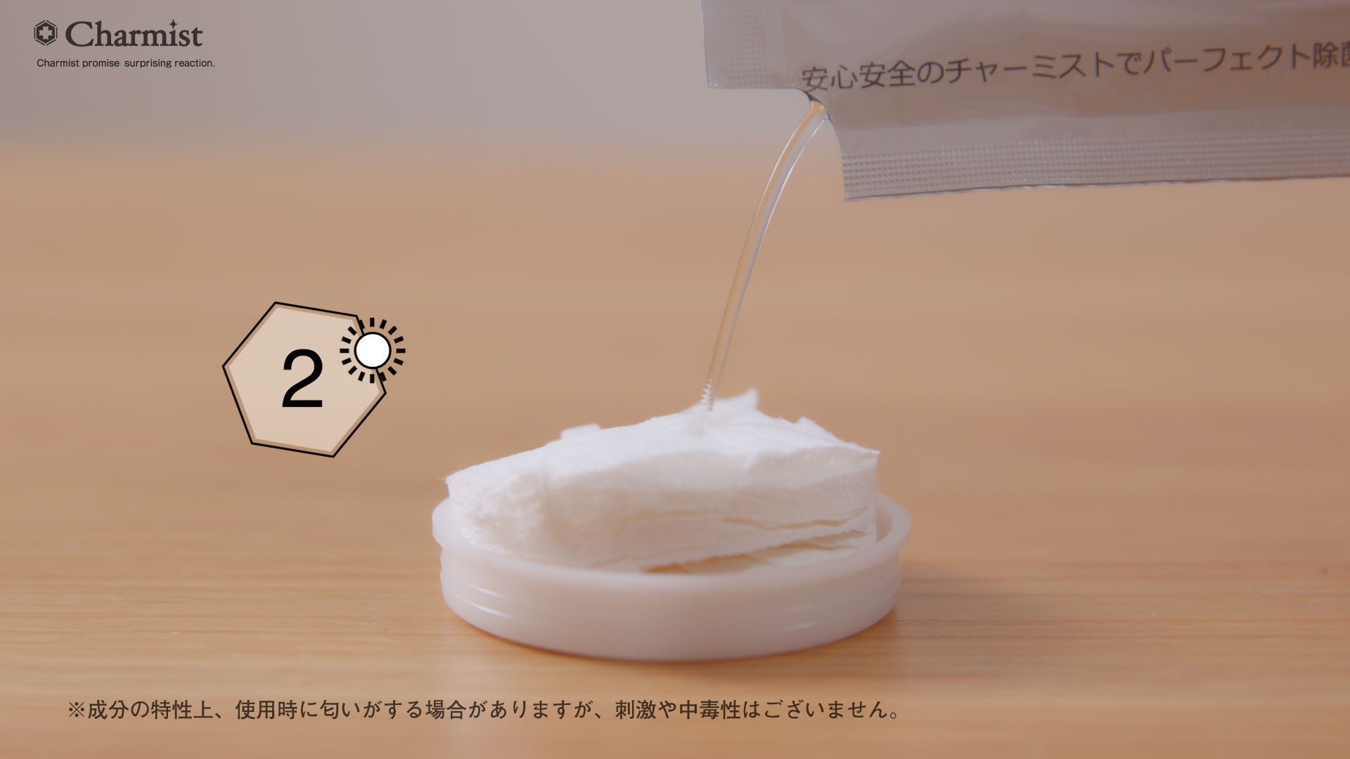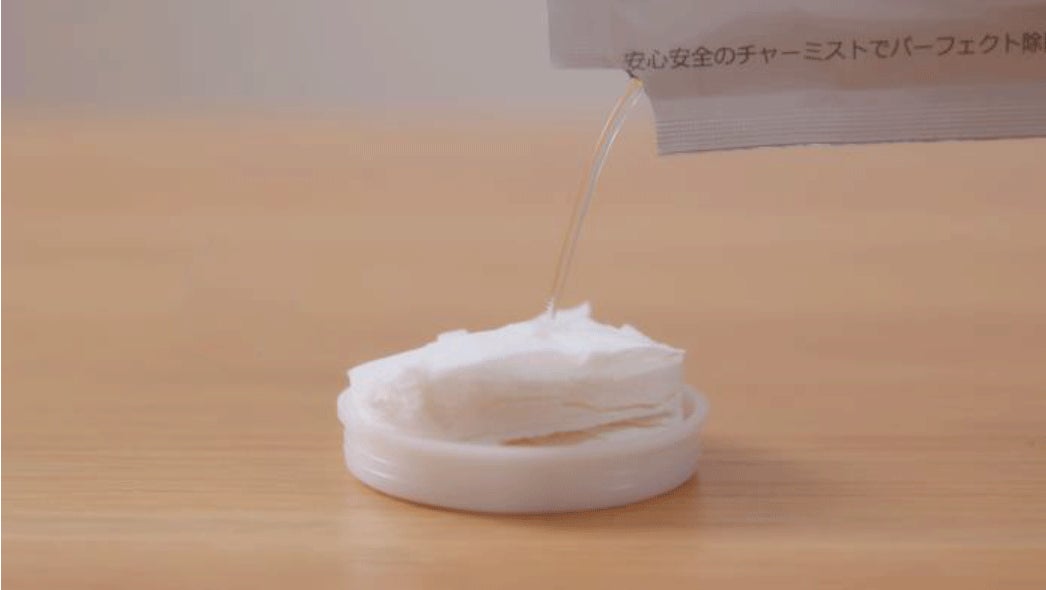 STEP2.チャーミスト25mlパックを一つ開封して、ゆっくりと圧縮タオルの上から注ぎます。