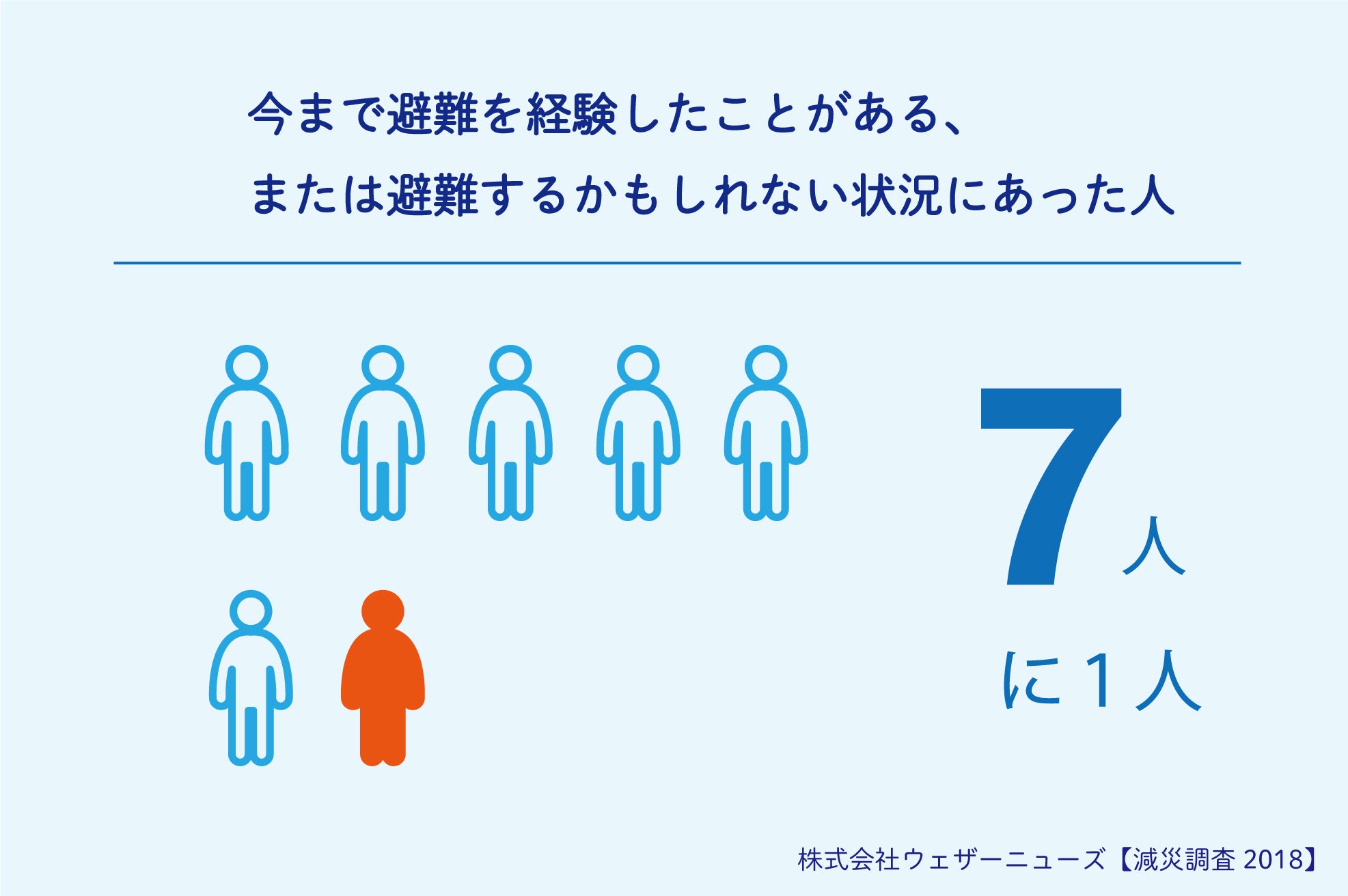 株式会社ウェザーニューズが2018年に行った【減災調査2018】の避難経験率調査では、「今まで避難をした経験がある」が全国平均で5%、「避難すべき状況はあったがしなかった」が全国平均で9%と7 人に1人は実際に避難を経験した、または避難するかもしれない状況 にありました。