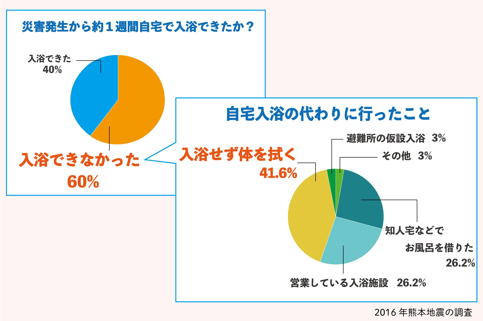 過去の経験によれば、災害発生からライフライン復旧まで1週間以上を要する ケースが多くみられ、2016年に発生した熊本地震の調査では、「水道やガスなどのライフラインが使えない」、「自衛隊などの救援が届かない」、「入浴支援を実施している場所まで移動できない」などの影響により、入浴できない人が震災発生直後から1週間では約6割 に上りました。