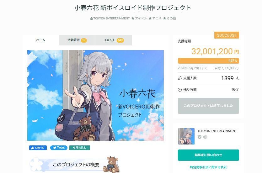 小春六花と言えば、TOKYO6会社が前回の5月28日から6月28日まで行いましたクラウドファンディング「小春六花 新ボイスロイド制作プロジェクト」にて、最終的に1408名もの方に3228万6200円もの大きな成果を上げたことで知っている方も多いかと思います。
