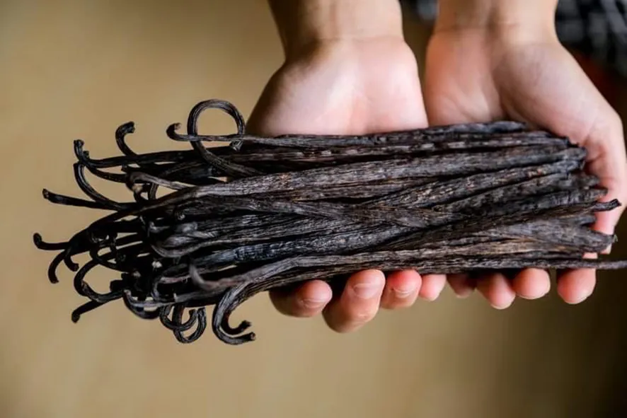 バニラはラン科のバニラ属の一種で、学名は Vanilla planfoliaといいます。バニラビーンズとはその実から採れる香辛料のことです。少し高価なアイスクリームの中に入っている黒い小さな粒々、それがバニラビーンズです。