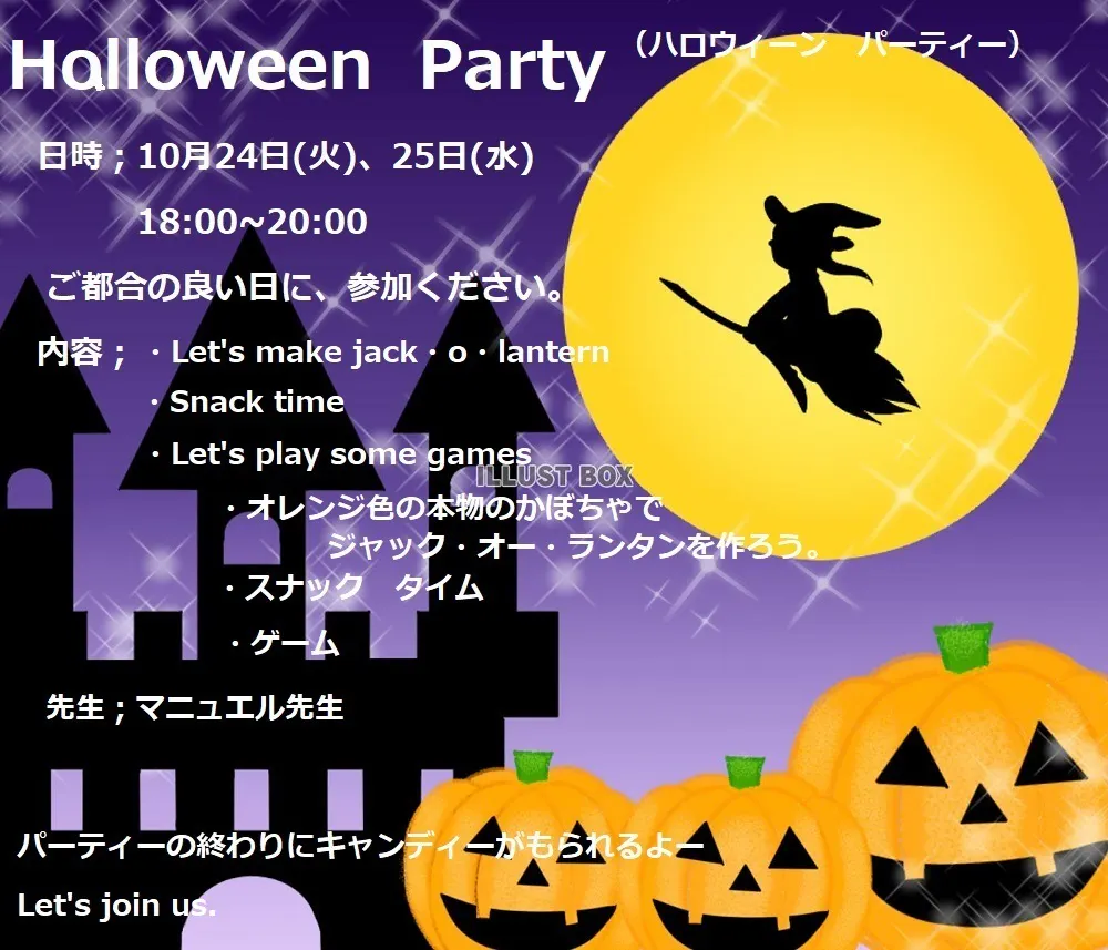 今回のクラウドファンディングへのご支援・ご理解、誠にありがとうございました。早速ですが、お約束した通り教室の生徒さん方に還元させていただきたく、ハロウィーンパーティーを下記のように開催します。