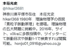 物理学の活動) もし正しければ、理論物理学を根底からくつがえす可能性を秘めた仮説として「暗黒エネルギー脈動原理、素粒子脈動原理」と命名した物理理論を提唱しています。自然界の全てが脈動(膨張と収縮)を繰り返していると言う仮説です。投稿サイトTWITTARに週1度のペースで投稿している2023.8月に投稿した記事は、物理学の有識者120人のいいねがありました。