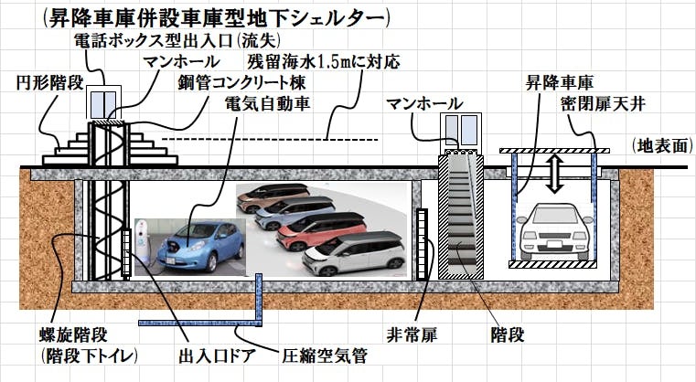 8) 昇降車庫併設車庫型100人用地下シェルター。
