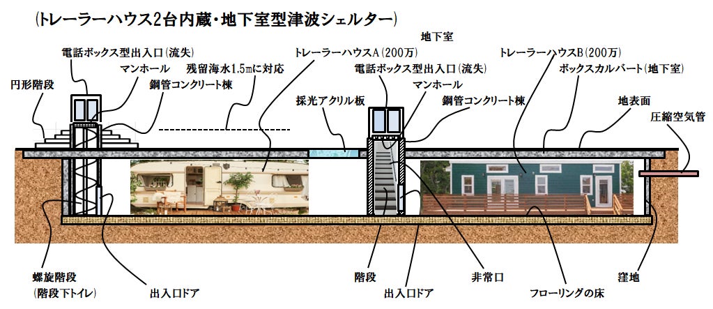 2) 100人用地下室型津波シェルターの具体的構造、工事手順、部品調達方法、施工業者等の構想確定。