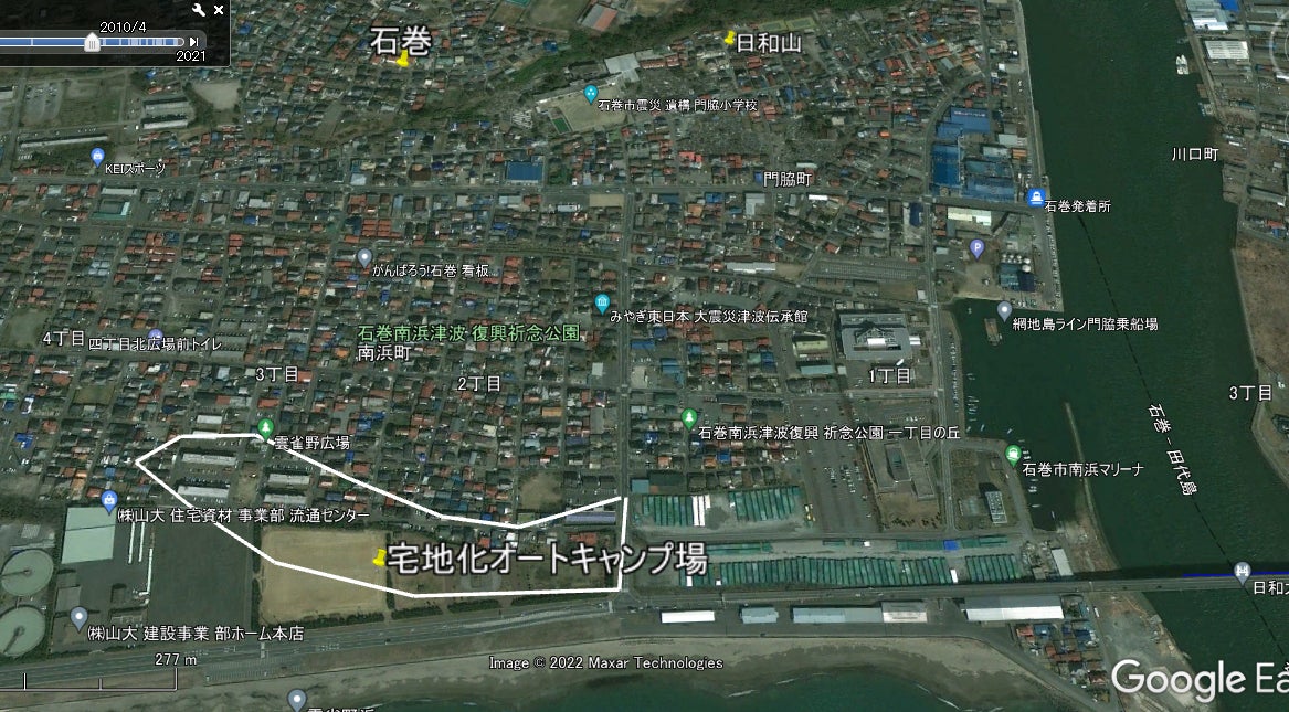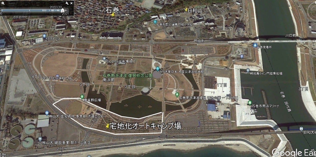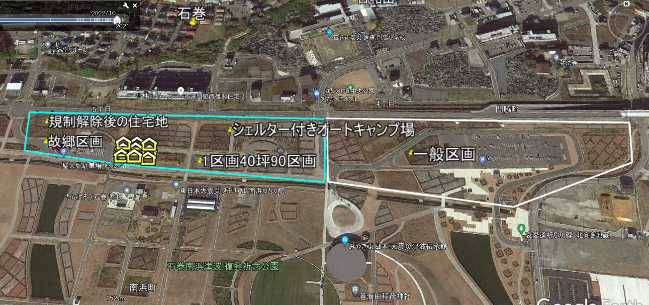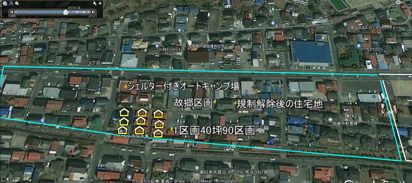 危険災害区域 石巻市 日和山地区 (津波前と2023年現在、いつかは津波前の住宅街にしたい)