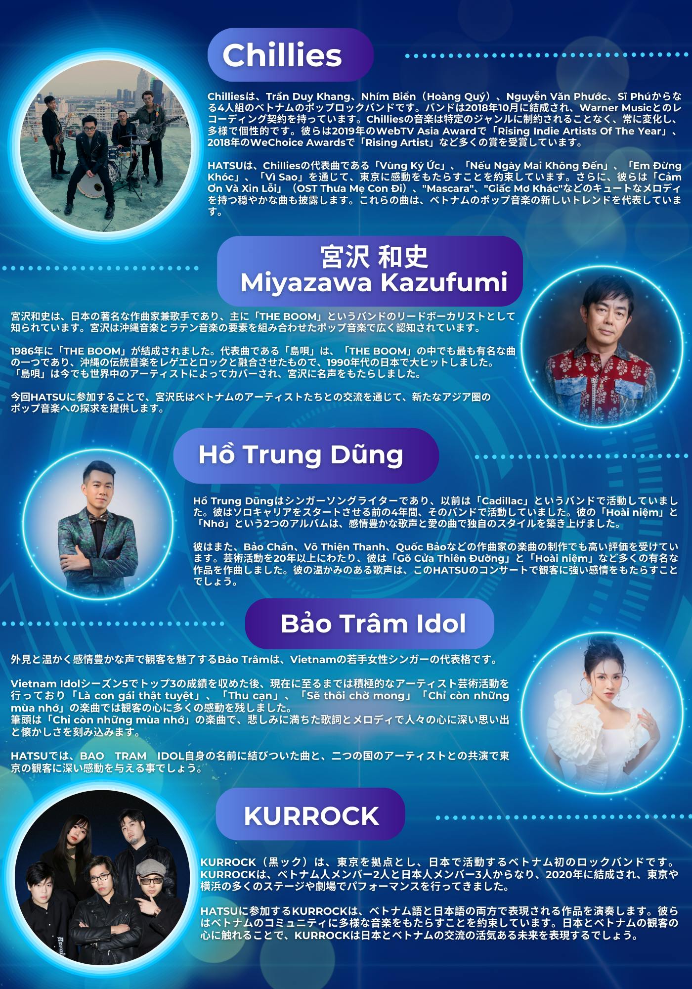「HATSU - LIVE CONCERT IN TOKYO 2023」は、2023年10月21日に東京で開催される音楽イベントであり、ベトナムと日本から有名なアーティストが出演します。出演者にはバンドChillies、歌手Hồ Trung Dũng、歌手Bảo Trâm Idol、バンドKURROCK、そして特別ゲストとして著名な日本人歌手 宮沢 和史(THE BOOM)Miyazawa Kazufumiが含まれています。