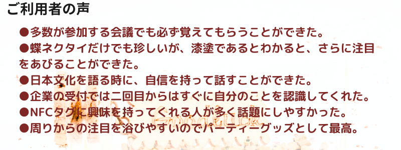 CONCERTOを発売して、5年が経ちます。これまで様々な方々に利用していいただきました。この度、米国のみで販売していたNFCtag付きのCONCERTOを日本で販売開始することにいたしました。私自身フォーマルの時もでカジュアルな時も幸福を呼ぶ「漆塗の蝶ネクタイ」を必ずつけております。壱、弐、参・・・と続いていく漢数字(大字)の「七」にあたる漢字は「漆」です。漆には素数でラッキーナンバーの7という数字まで隠されています。「これをつけていたおかげで、お客様に顔を覚えてもらい仕事が受注できた」という嬉しい声も頂いております。