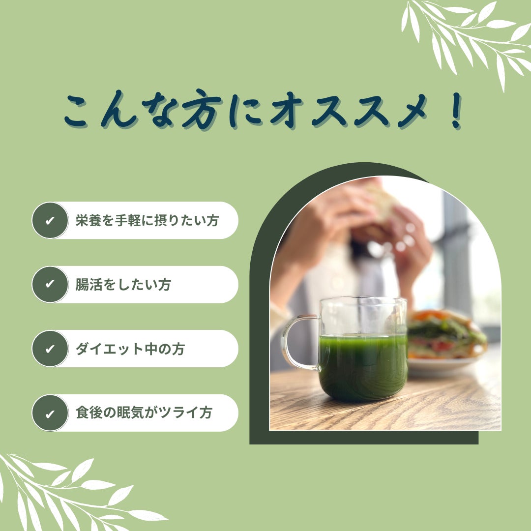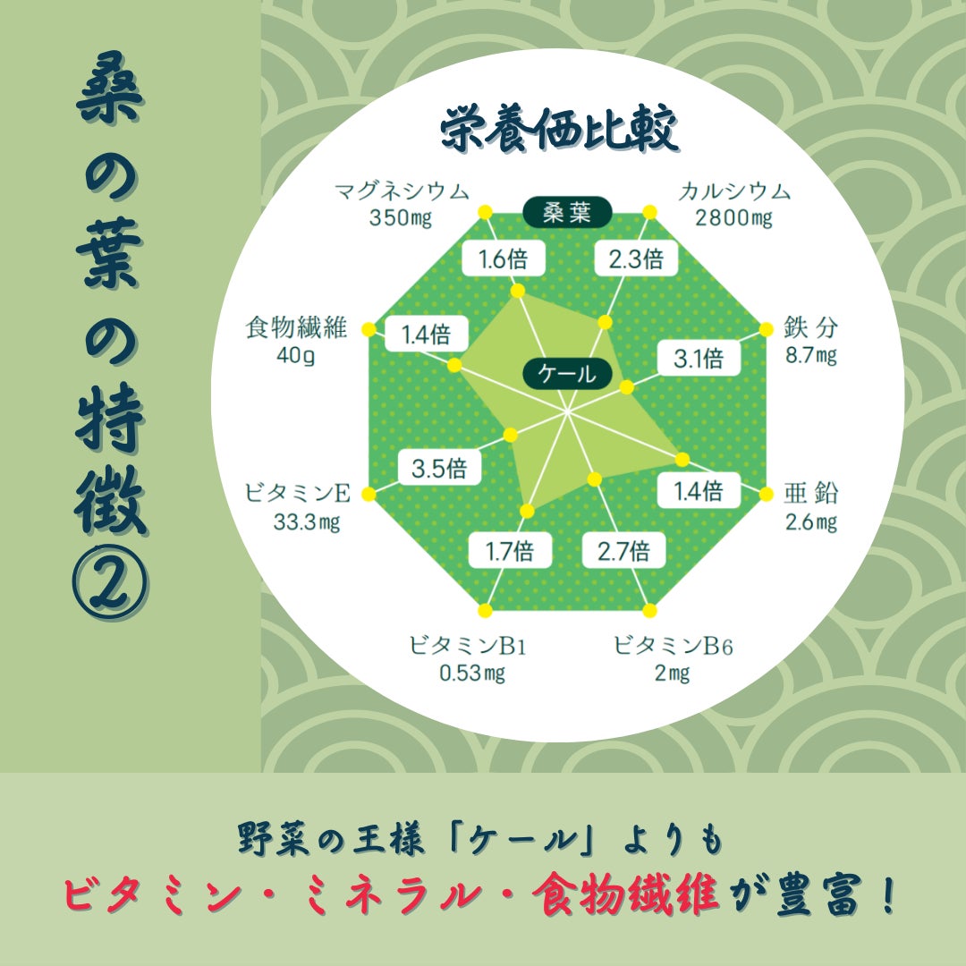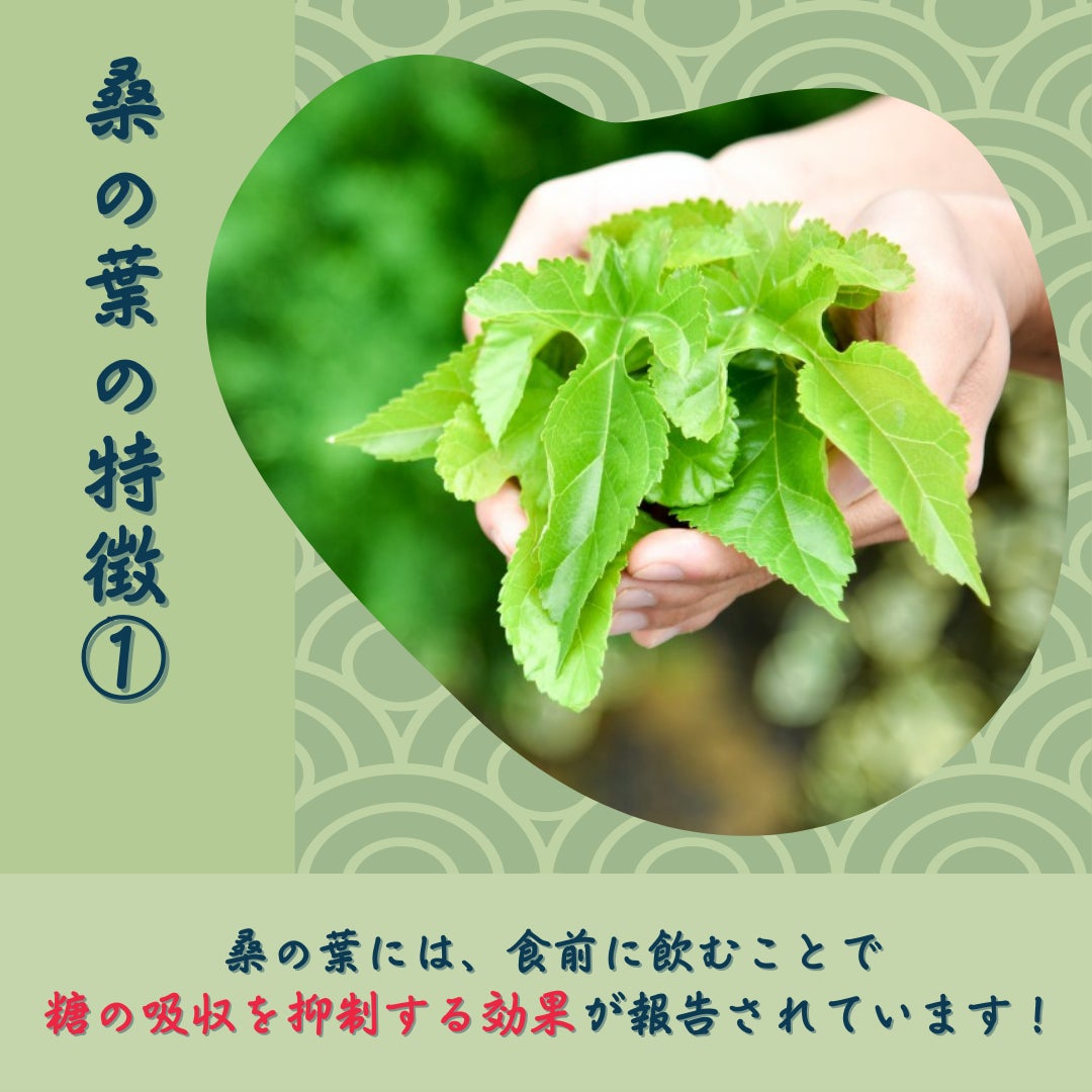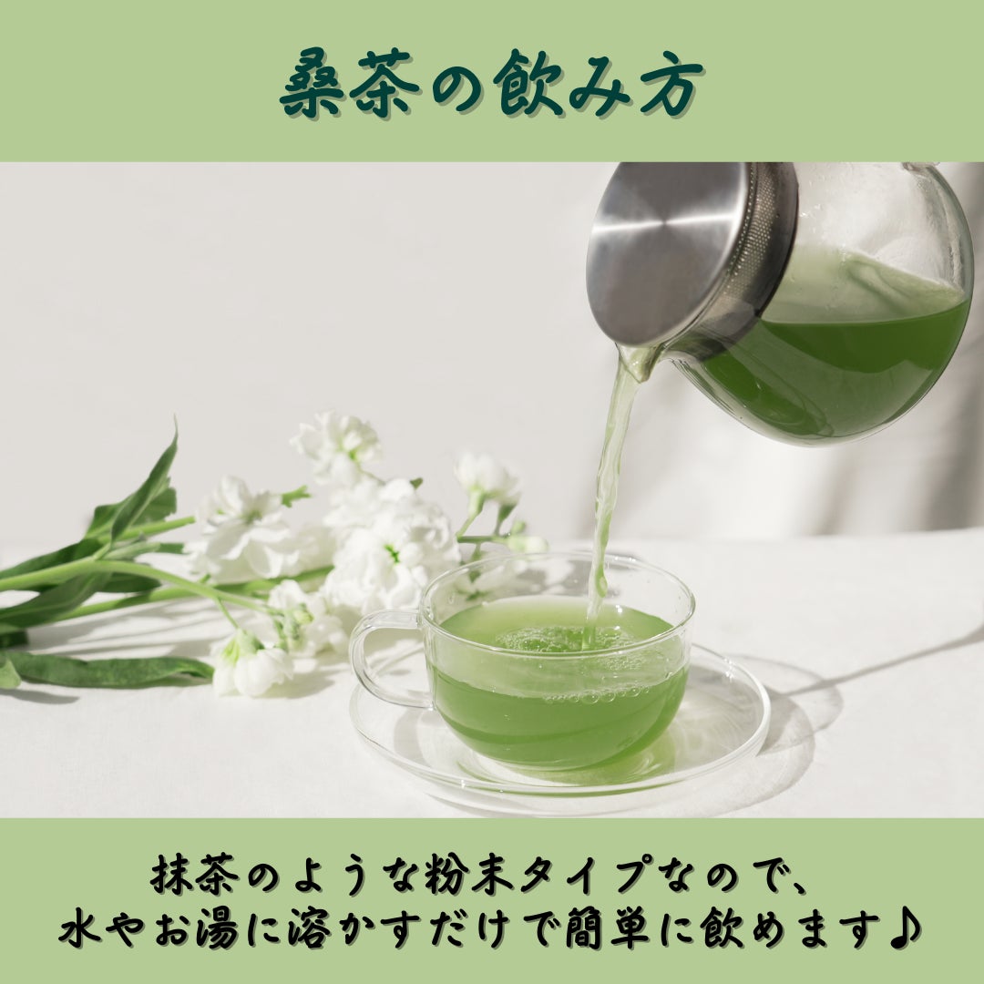 桑茶とは、栄養豊富な「桑の葉」を日本茶製法で粉末にした飲料で、食前に飲むことで糖の吸収を緩やかにすることが報告されています。その結果、ダイエットや腸活にはもちろん、食後の眠気予防にもうってつけ!