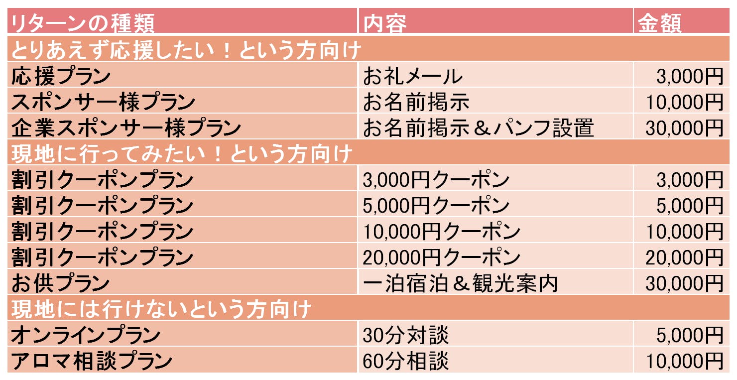 かねてより「物の豊かさより心の豊かさ」を重要視したいと考えており、リターンはモノよりコトをご用意しました。