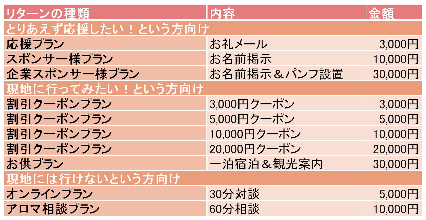 かねてより「物の豊かさより心の豊かさ」を重要視したいと考えており、リターンはモノよりコトをご用意しました。