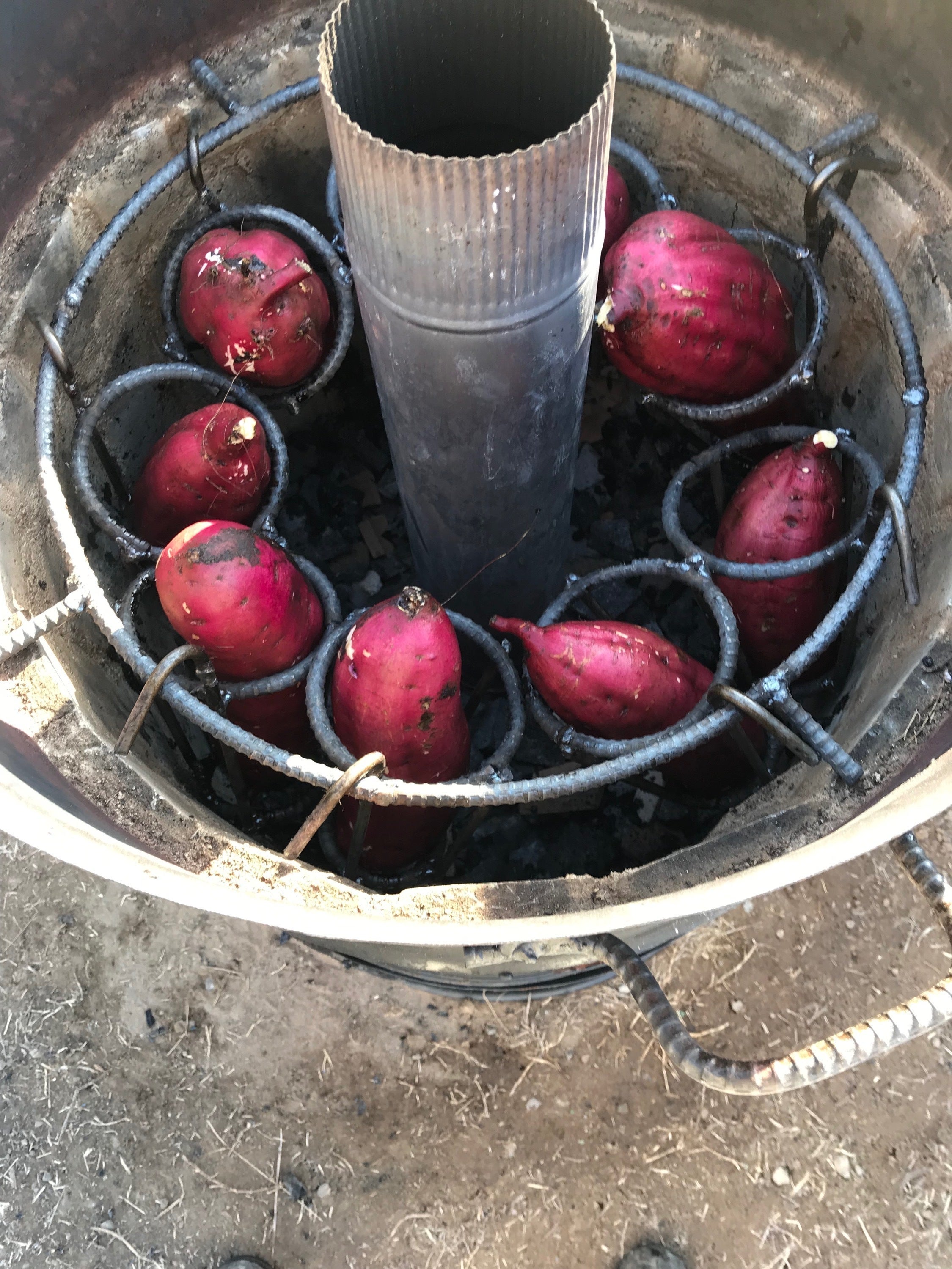 円筒形の石窯の真ん中に煙突が通り、下の炉で焚いた炎が煙と一緒に煙突を通り二次燃焼により石窯の内部が高温になります。石窯の中に専用の器具でサツマイモを吊るして焼きます。ロケットストーブを応用した大きな壷焼き芋のような窯です。