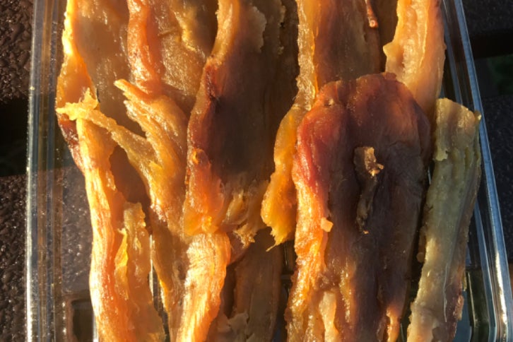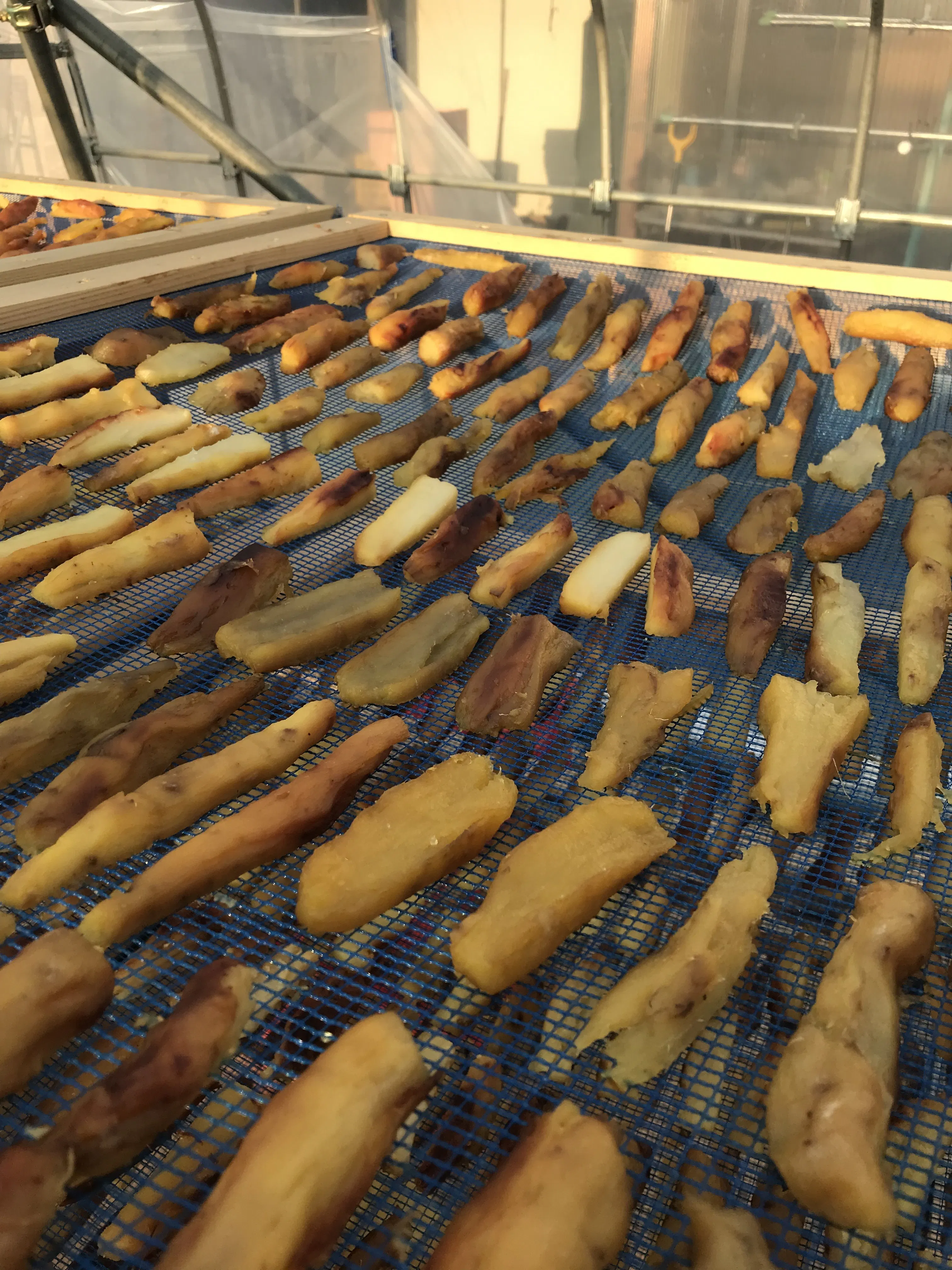 焼き芋は一日冷やしてから皮や焦げたところを取り除きスライスかスティックにして天日で一週間程干して完成です。