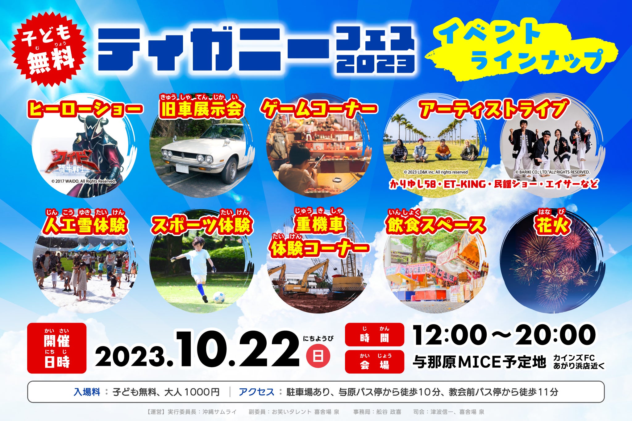 「ティガニー」とは沖縄の方言で「手助け・お手伝い」。このイベントは、主に貧困家庭の子どもたちやその保護者の方々が一緒に楽しむことを最大の目的としています。困難な状況でも、大人が子どもたちに手を差し伸べ、夢を持ってもらう手助けをする場を創造したいと考えています。さらに、この手助け(ティガニー)の輪が地域や企業に広がることを願っています。このイベントが子どもたちの記憶に残り、彼らが大人になった時に、次世代の子どもたちに手助けをして欲しいと願っています。