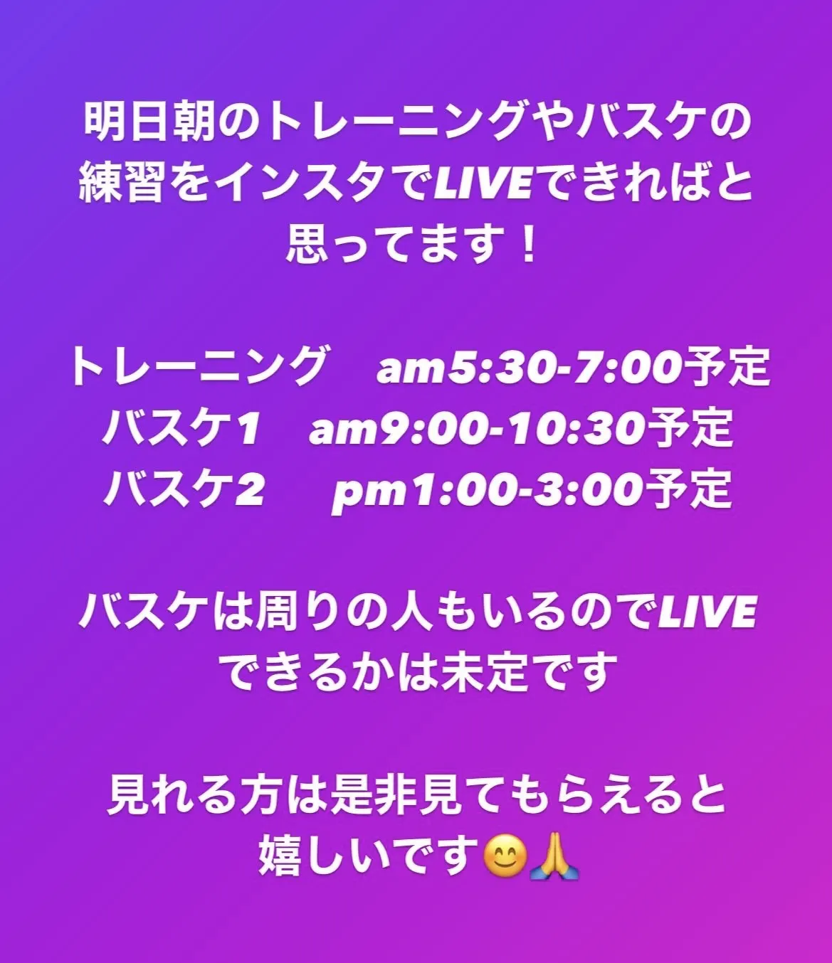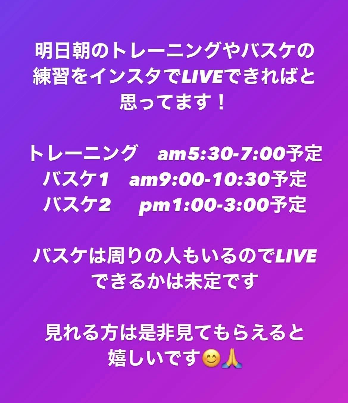 本日、9/28(木) 僕が普段やっているトレーニングやバスケの練習をインスタでLIVE配信しようと思います。