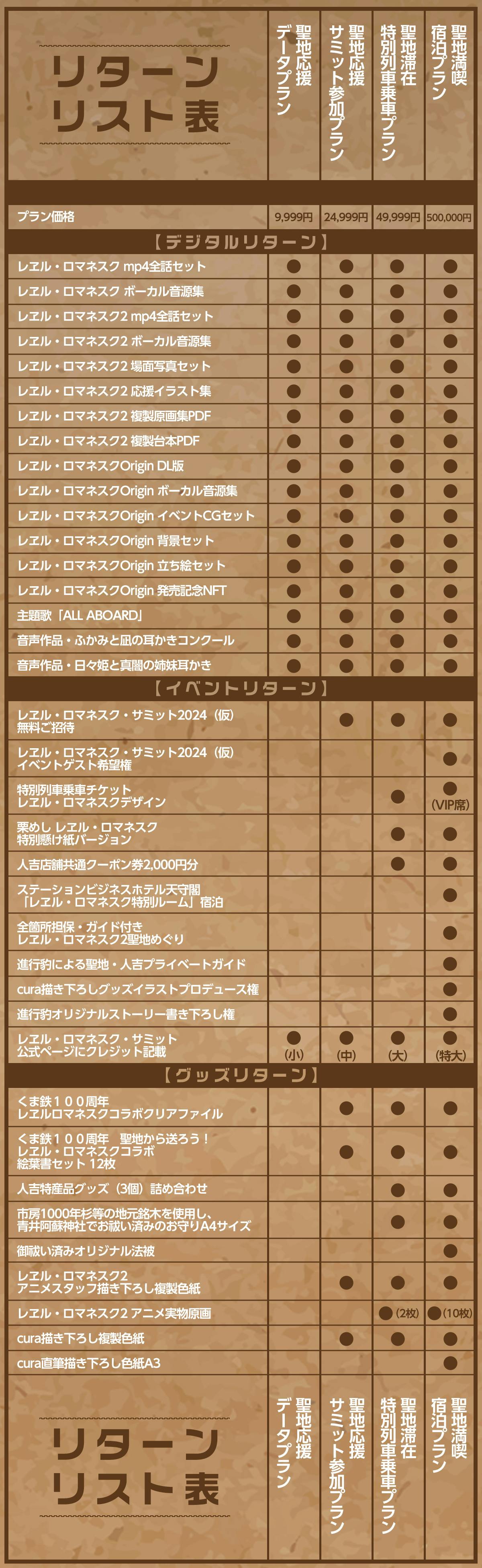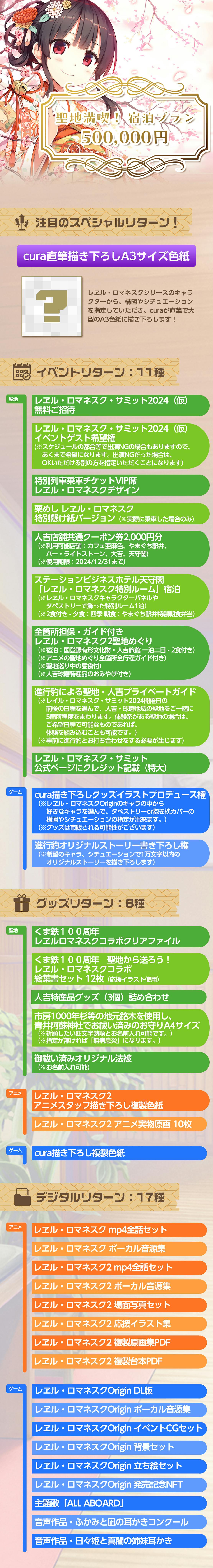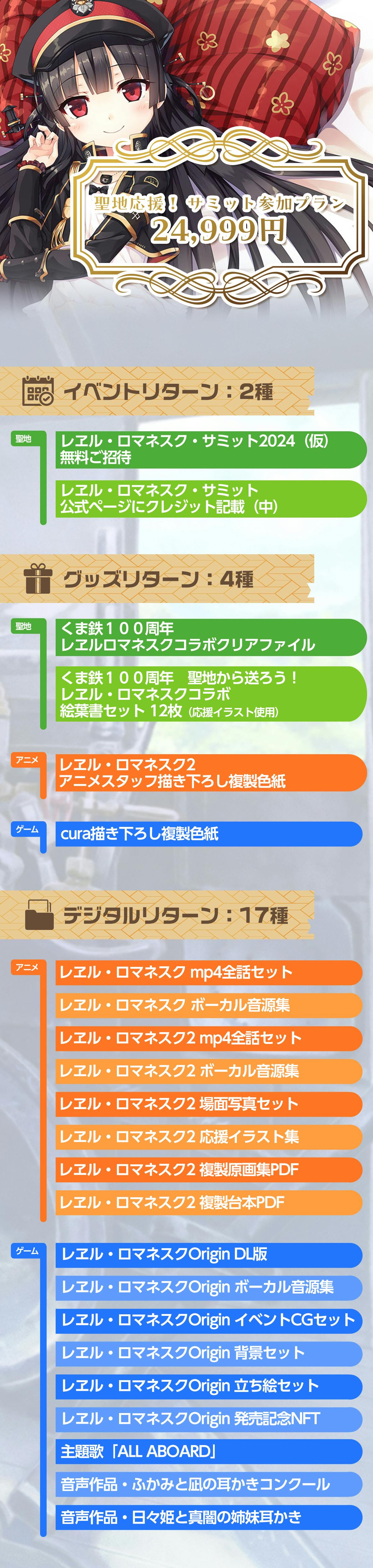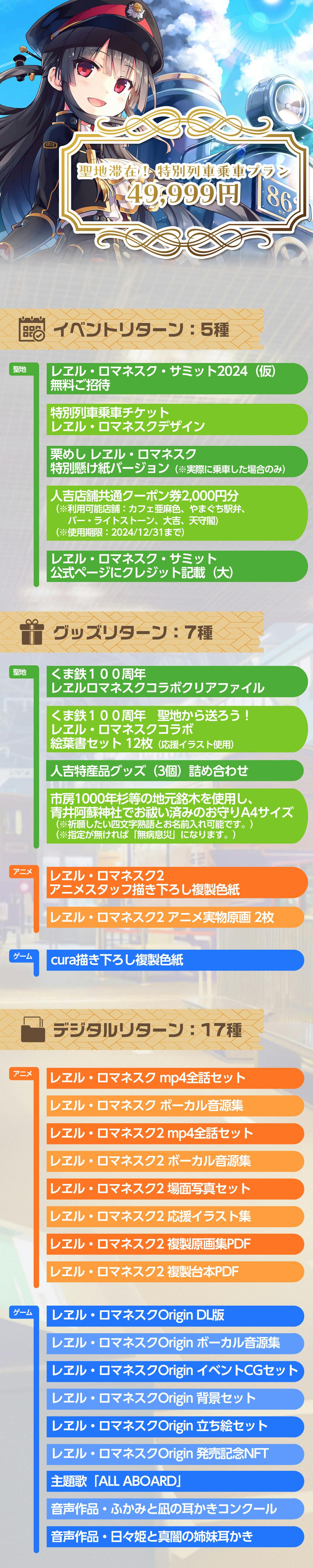 かかる状況を改善し、今年、2024年10月26日、27日に開催予定の『レヱル・ロマネスク・サミット2024』を、シリーズのファンのみなさまと人吉・球磨のみなさまに、等しくお楽しみ・お喜びいただけるイベントへと飛躍させていくために、このクラウドファンディングでは特別に、聖地応援プランを主体とするさまざまなプランをご用意いたしました。