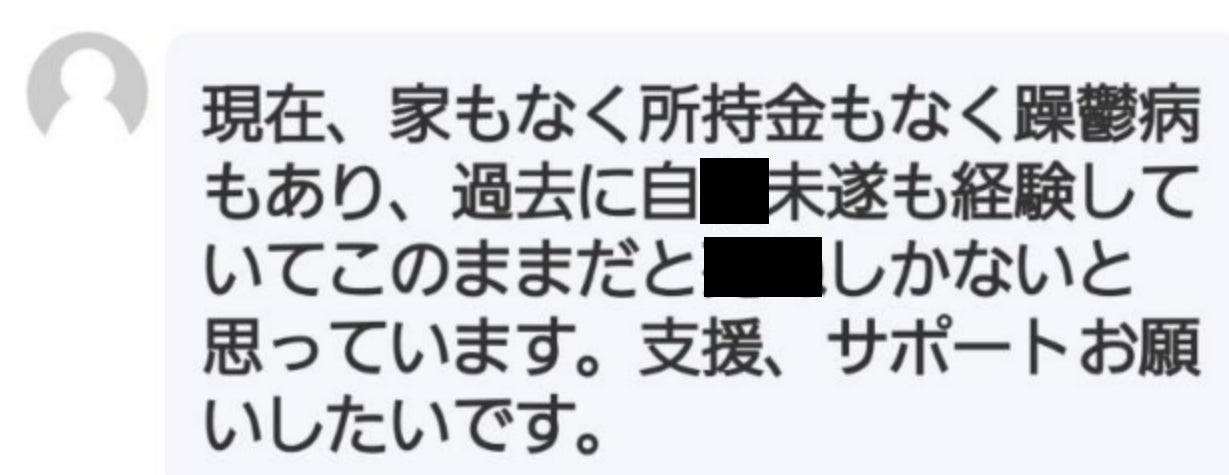現在家も所持金も無く躁うつ病もあり助けてほしいと連絡がありました。