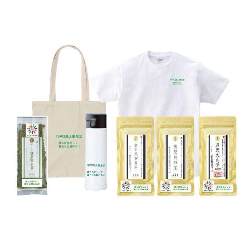 100,000円 お礼のメッセージ、ステンレスボトル、Tシャツ(1枚)、トートバッグ(1枚)、お茶(日本各地のお茶3種) 、ホームページに名前を掲載、名誉賛助会会員