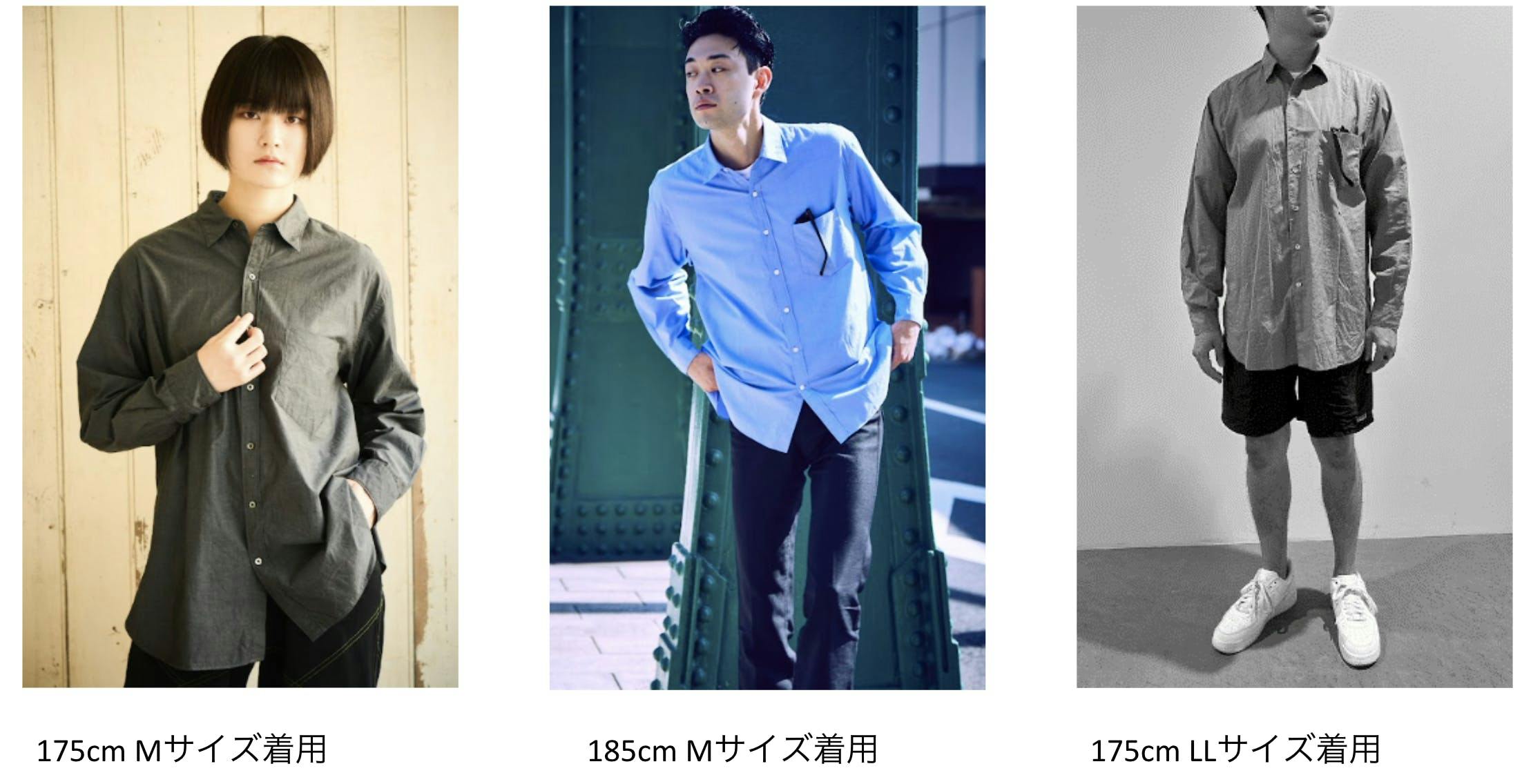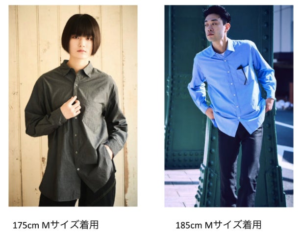 サイジングについては、着丈について熟考し、サイズが上がることで縦に長くないように調整しています。174cmでLLサイズを着用しても横幅にはゆとりがあれど、着丈がそこまで長くなり過ぎないバランスです。リラックス感のあるドレスシャツに仕上がったと思います。(写真右参照。)