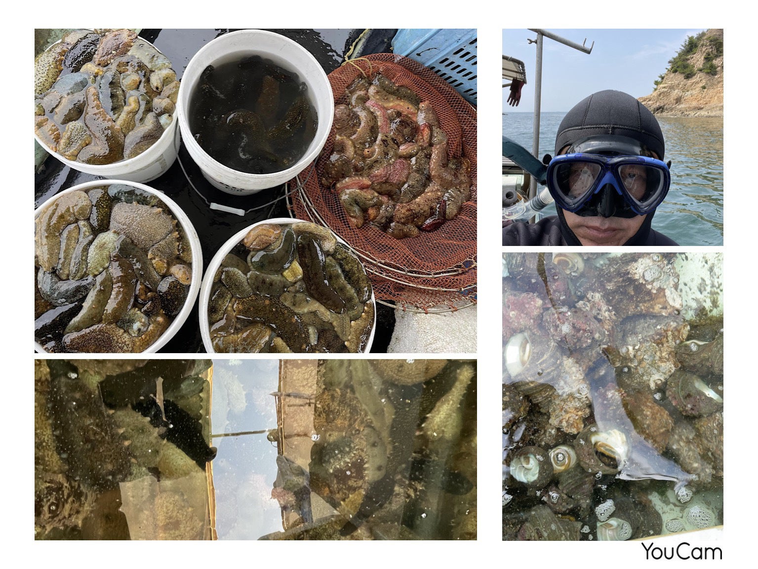 年末から三月末までは、極寒の海に、素潜りで水深10メートル前後まで潜り、一つ一つ傷つけないように、なまこやサザエ、岩牡蠣を獲っています
