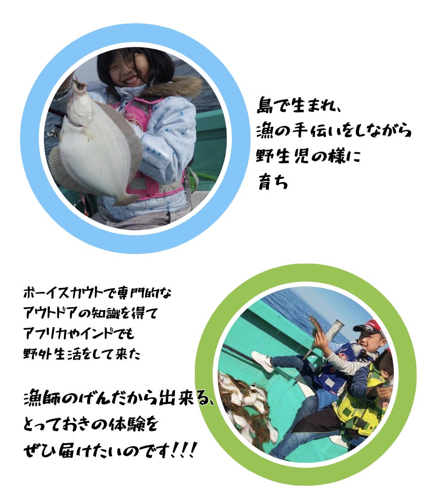 遊漁船は釣りがメインでしたが、釣りだけじゃ勿体ない。長年釣りをして来た私でさえ、漁師になり初めて自分で入れた網に、魚が掛かっていた時の喜びと、感動は半端なく感動ものでした。遊漁船時代、子供達の笑顔と歓声ほど楽しく感じられるものは無い!と感じていたことから、特にお子さん連れに来てほしいと思っています。地球の未来は子供達が背負っています。