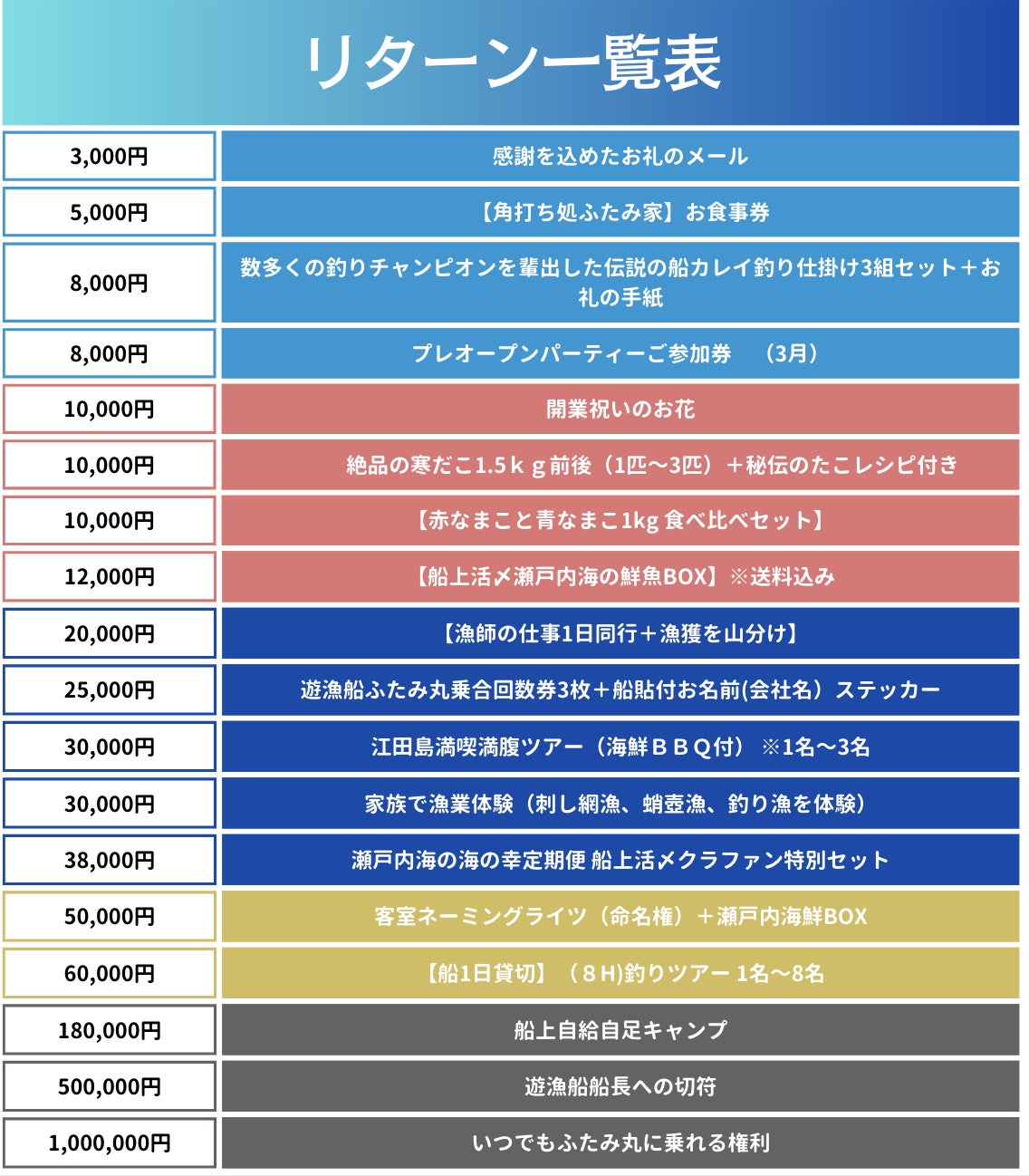 リターン品は、私の獲った四季折々の鮮魚と漁師体験、乗船券が中心になります。