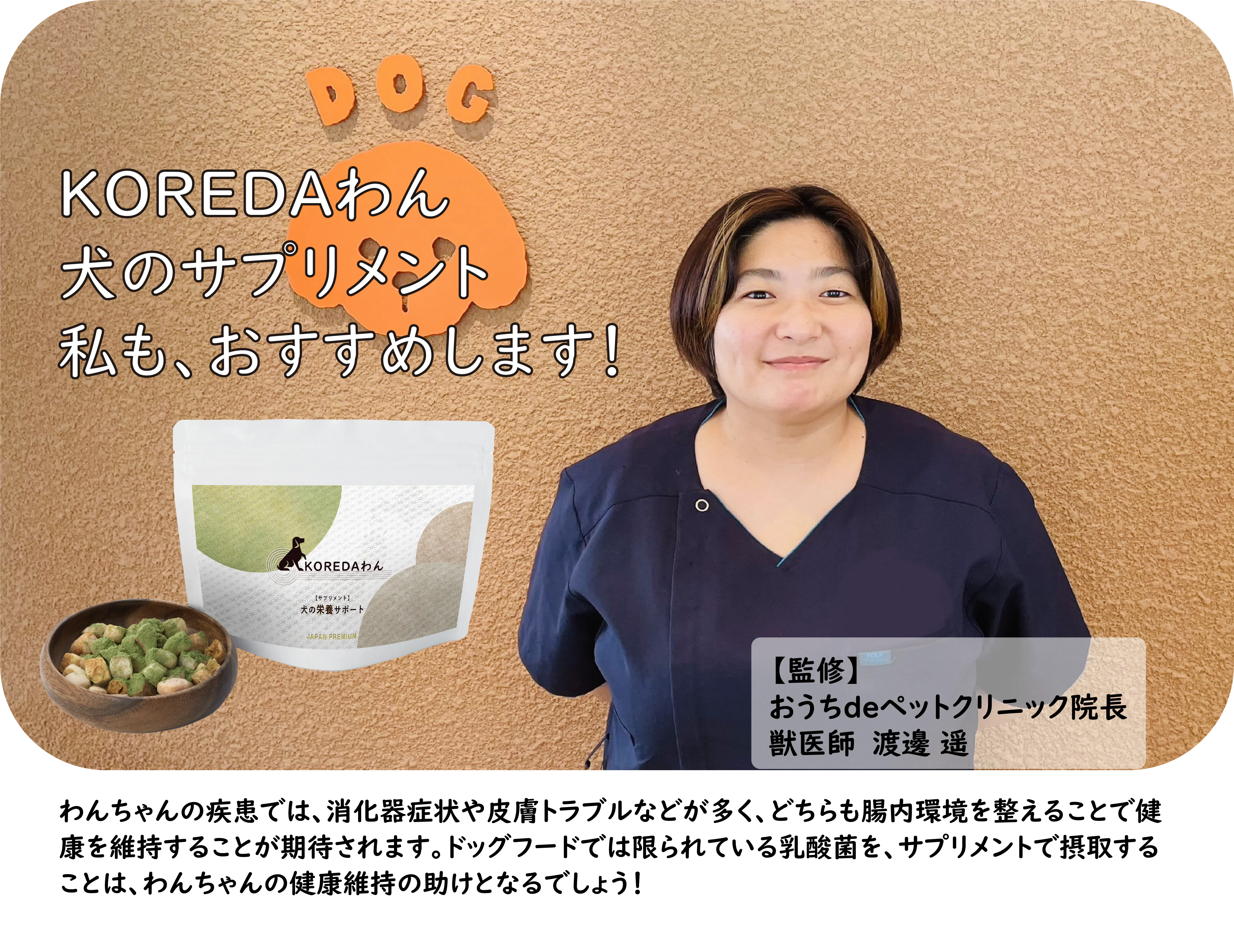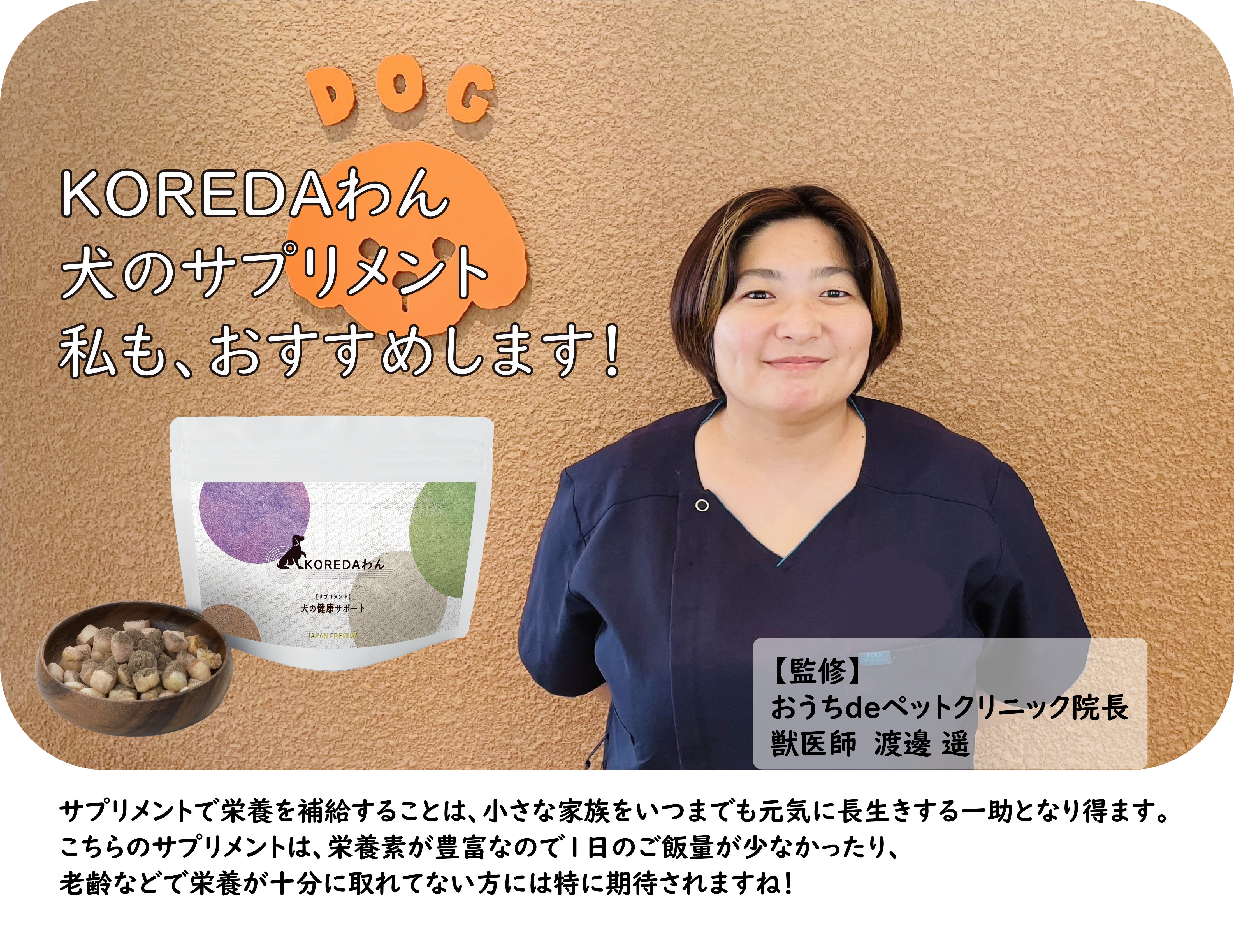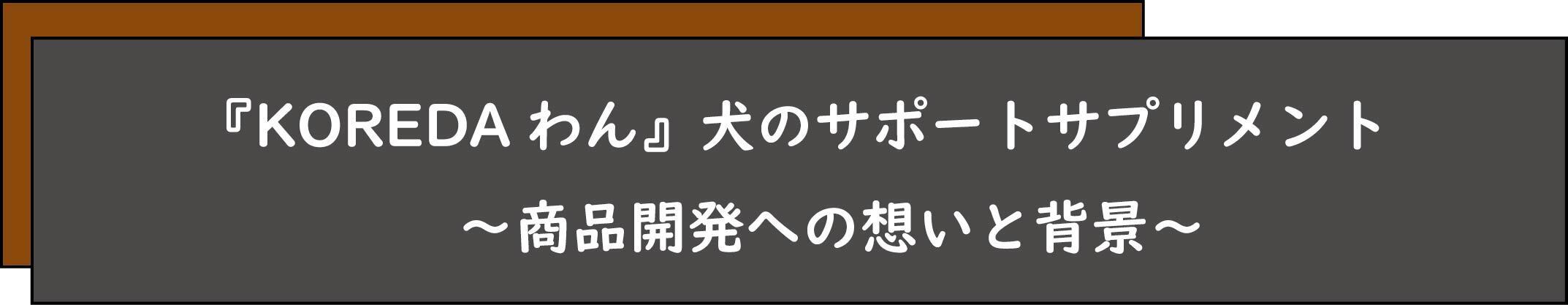 わんちゃんも人間と同じように予防医学の考え方から、病気になってから対処するのではなく、日々バランスよく栄養を摂ることで予防的に健康を維持し、病気になりにくい健康的なカラダづくりをすることで、わんちゃんと飼い主様の幸せな日常生活をより育んでいただきたい。『KOREDAわん』犬のサポートサプリメントが、そのサポートとなることを願っております。