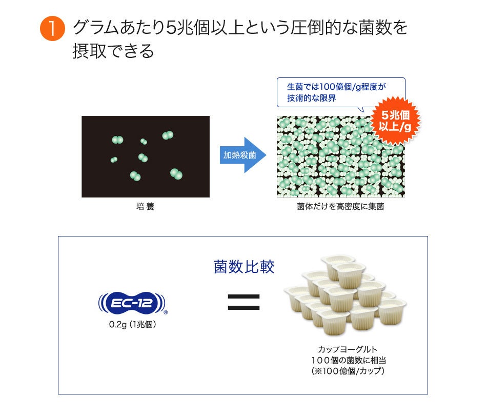 乳酸菌EC-12乳酸菌EC-12は、1gあたり5兆個以上の菌数で死菌であるため胃酸に強く、少量でもしっかり腸で摂取ができます。腸内環境を整え全身の白血球が活性化されることで、免疫力も高める働きがあります。