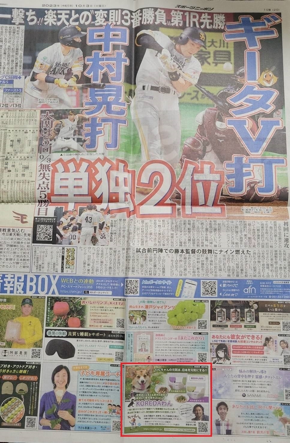 2023年10月3日発行のスポーツニッポン新聞(西部本社版)/九州全域・山口・島根一部に本プロジェクトの広告掲載をしていただきました!
