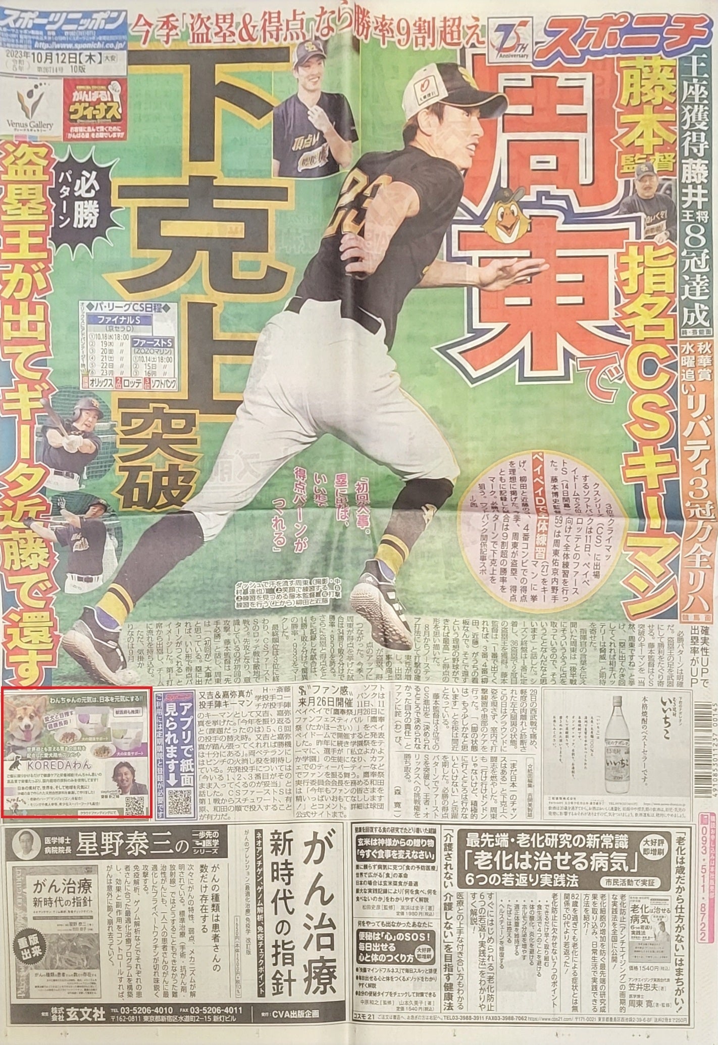 【2週連続】2023年10月12日発行のスポーツニッポン新聞(西部本社版)/九州全域・山口・島根一部の1面書面に、本プロジェクトの広告掲載をしていただきました!