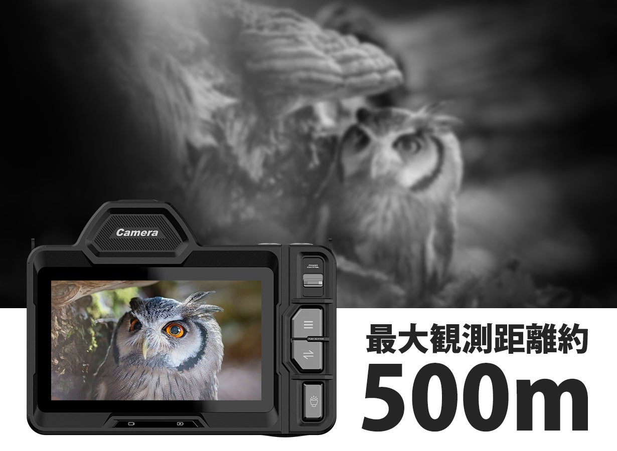 フルカラー撮影赤外線カメラ「虹彩」は、白昼または夜なら街灯など光源のある環境では最大500mまで観測可能です。真っ暗な環境でも、白黒画面で赤外線ライトにより観測できます。