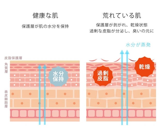 そして実は体臭の原因も、肌の乾燥による過剰皮脂の可能性もあるんです。臭いを取らないととアカすりのようにゴシゴシ強い摩擦をかけたり、石鹸などでしっかり洗うことが一般的ですが、逆効果になっていることも。