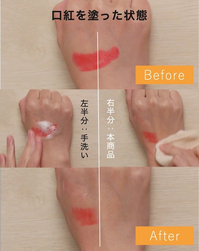 口紅を塗り、泡立てた洗顔剤をつけ、左半分は手で、右半分は本商品で洗った場合。